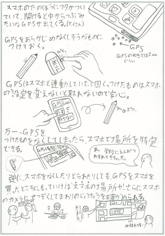 今でもうすいタグみたいなGPSはあるけど、もっと小さく、もっと便利になっていったら…と想像していたらこんな風になりました。私自身、忘れものやなくし物が多く、前からこんな物があったらな~と思っていましたが、しっかりと形にしたのは初めてです。今の時代、スマホはすごいスピードに進化しているのでいつかこんなスマホができてほしいなと思っています。