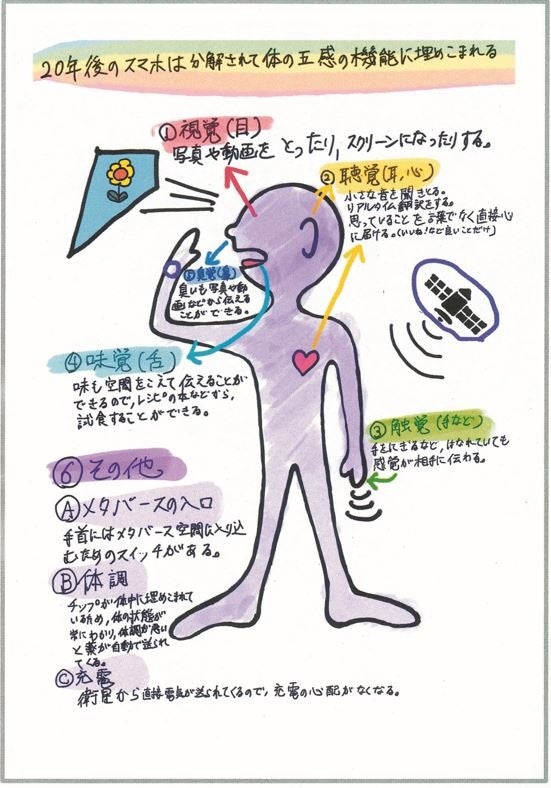 20年後のスマホはスマホの形をしておらず、それぞれの機能が人間の体の中に取り込まれ、人間の能力を補ったり、拡張したりするのではないかな?と思って考えてみました。だから、スマートフォンならぬスマートヒューマンというタイトルにしました。