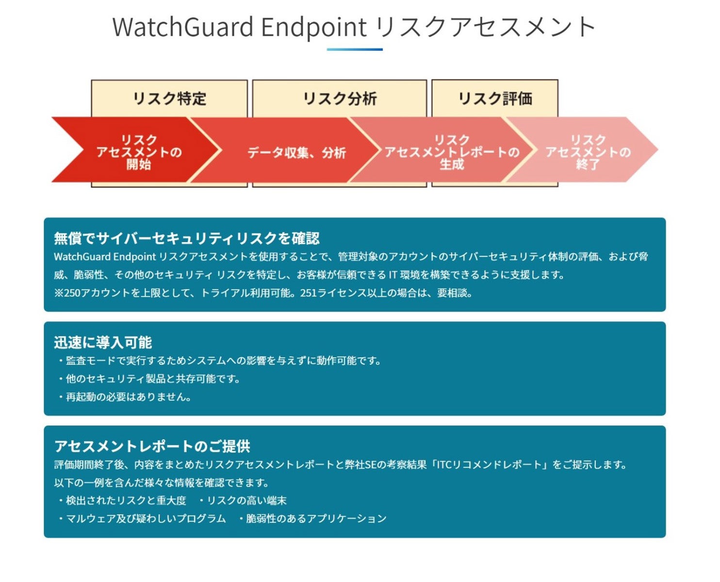 株式会社情報技術センター(本社:東京都港区、代表取締役社長:渕脇德也、以下 ITC)は、ウォッチガード・テクノロジー(以下、ウォッチガード)のWatchGuard EPDR(エンドポイントセキュリティ)を用いた「WatchGuard Endpoint リスクアセスメント」の提供を開始しました。