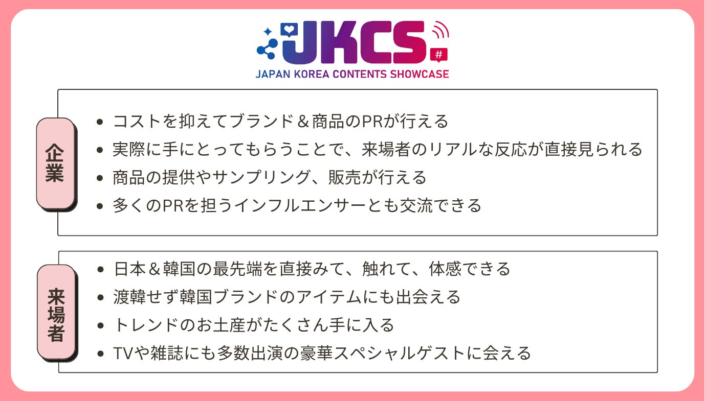 また『JKCS』では、互いに影響され合う日韓の企業が一堂に集合することで、コンシューマーへのPRだけでなく両国企業にとって新たな学びや気付きも生まれるイベントにもなると期待しています。