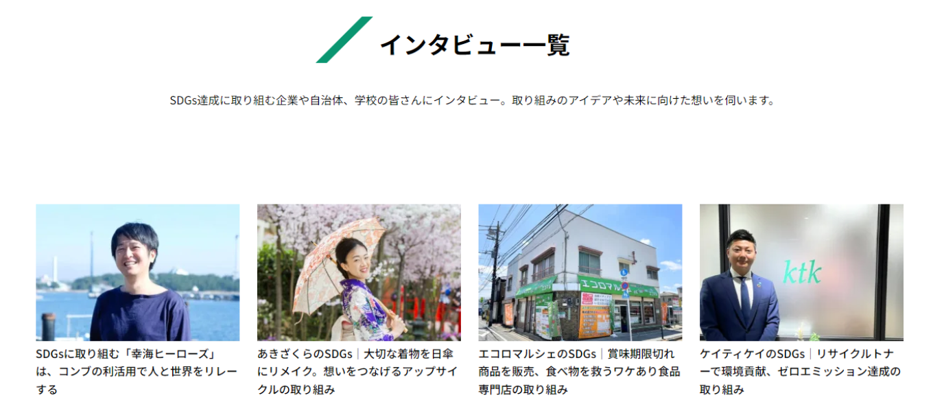 SDGsに取り組む企業や自治体、学校の皆さんにインタビューを行います。取り組みの詳細や未来に向けた想いを詳しく伺います。