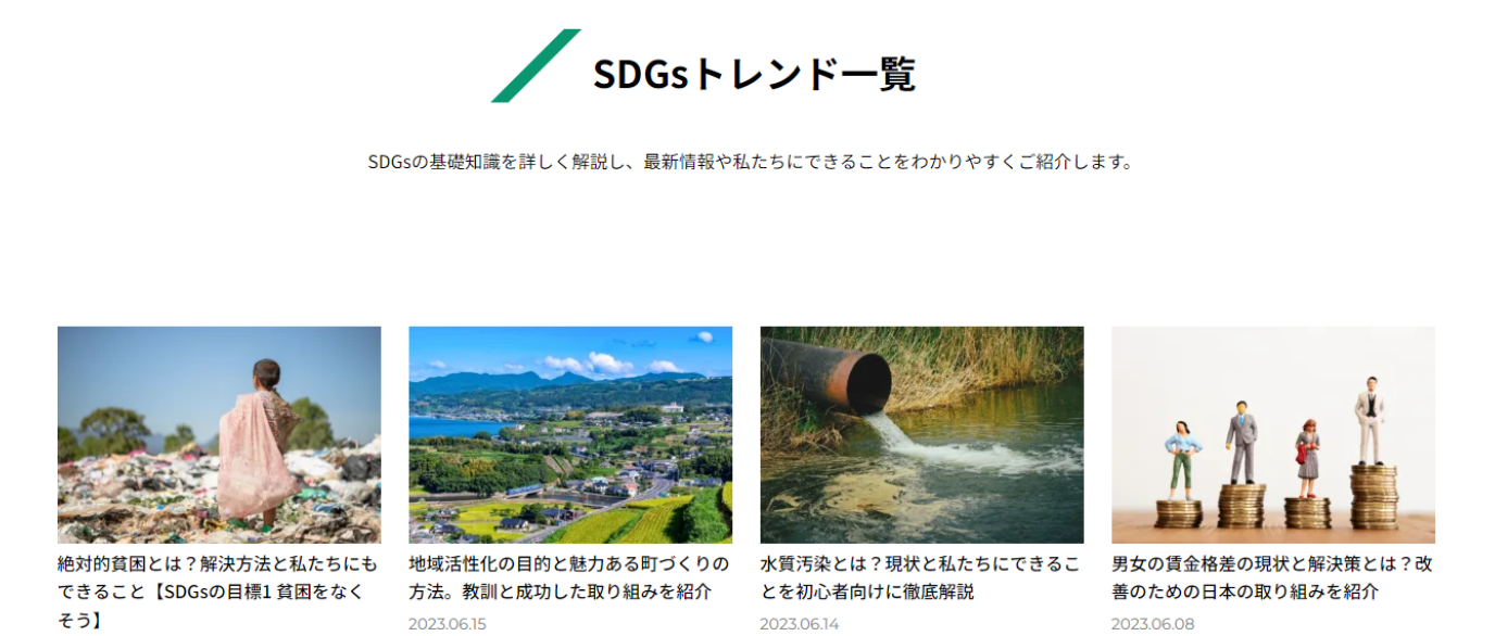 SDGsの基礎知識や背景、知っておきたい用語などを詳しく解説し、取り組みの具体事例や私たちにできることをわかりやすくご紹介します。