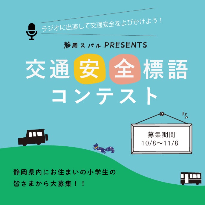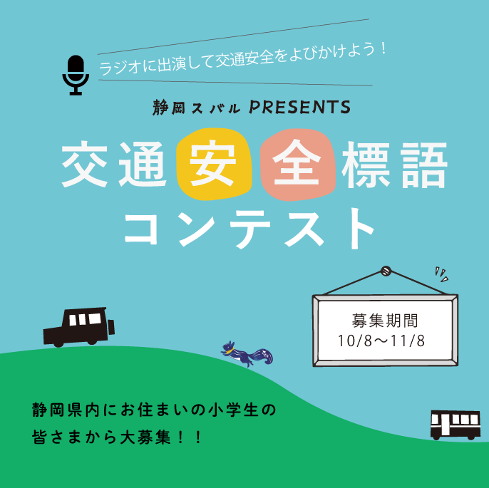 ・優秀作品に選ばれたお子さまは、「交通事故ゼロ」を推進する静岡スバルのプレゼンターとしてSBSラジオCM収録で標語を紹介していただきます。(応募された標語は放送にあたってSBSの規定による審査がございます。また、放送時間の都合などの理由で文面の調整をさせていただく場合がございます)