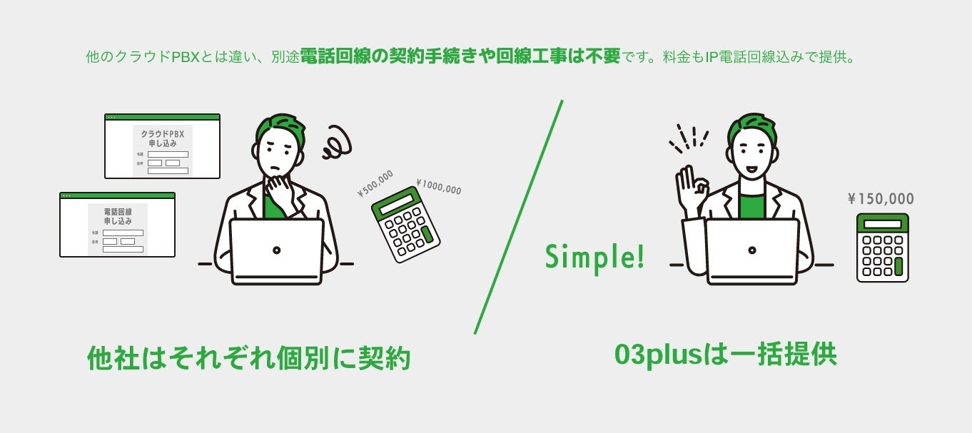 このような特徴から、03plusは店舗/支店毎の固定電話の初期/ランニングコストを削減できるだけでなく、手軽に使える利便性の高さから、企業本部における回線契約/工事の手配業務や、各拠点への導入レクチャーといった業務の煩雑さも軽減することが可能になります。