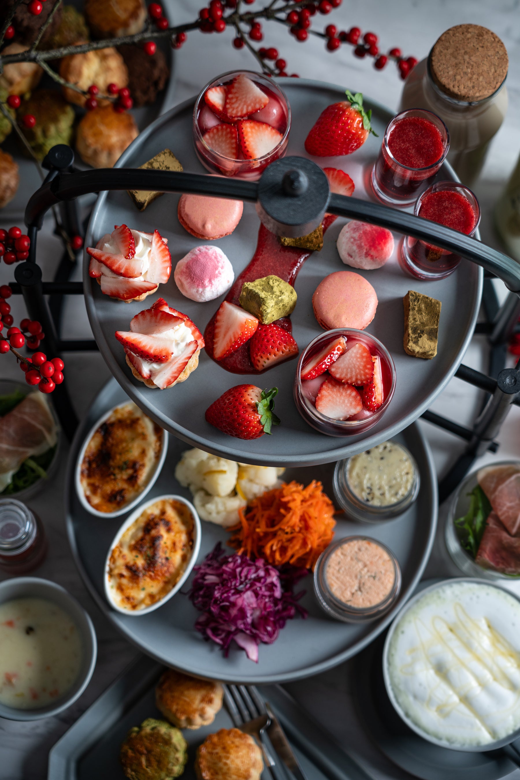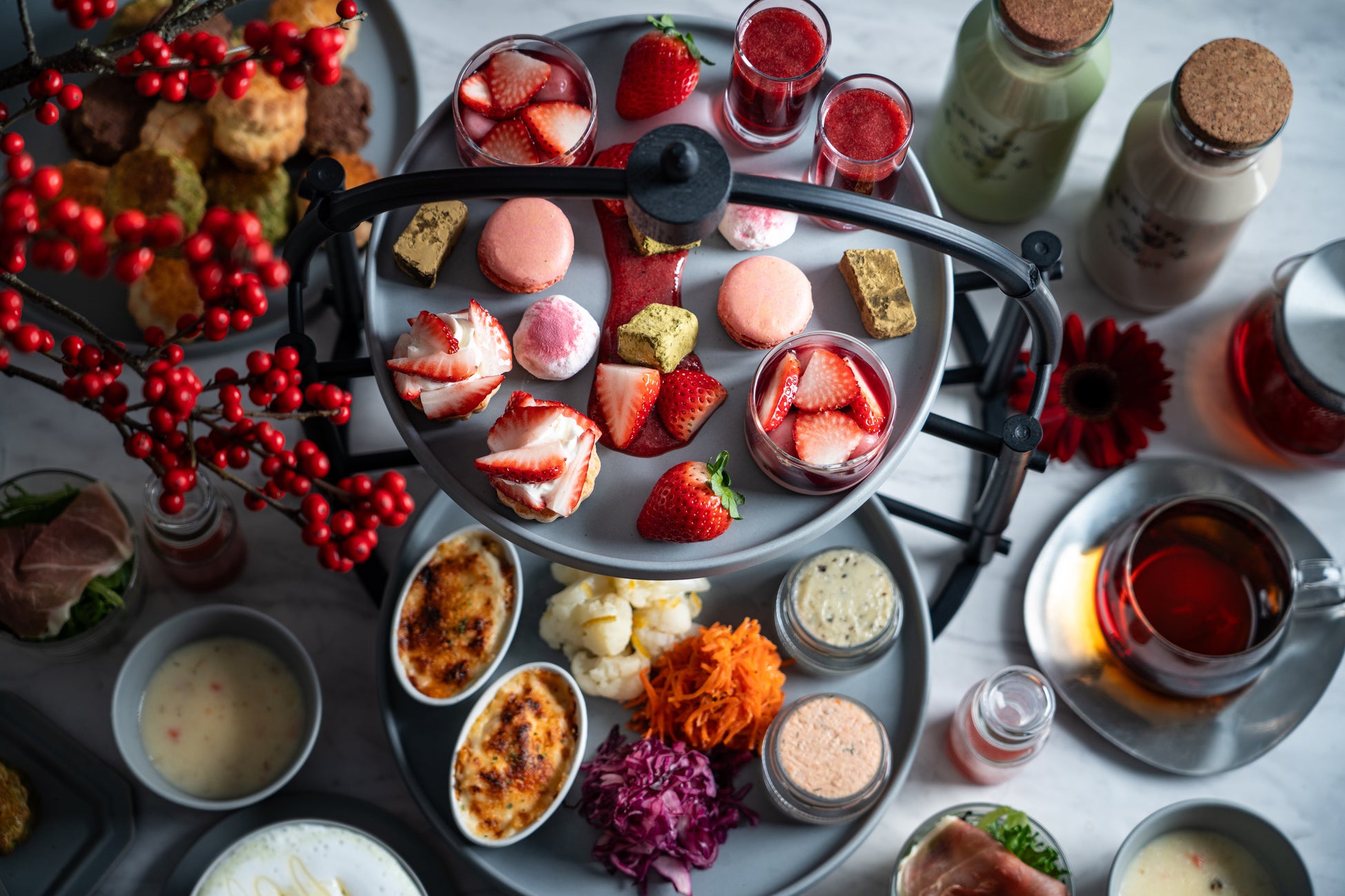 冬の嵐山の幻想的な静の佇まいと対をなすように、エネルギーに満ち溢れた情熱的なブリリアントレッドを表現した今回の特別なメニューは、鮮度のよい摘みたて完熟いちごを、それぞれに洗練されたテイストで引き立たせ、存在感のある組み合わせで作り上げています。鮮烈なレッドカラーが目を引くローズヒップティーは、ストロベリーソースと合わせ、透明感のある華やかなジュレにしました。また、甘酸っぱいラズベリーソースに甘くとろけるストロベリーピンクのババロアを合わせた白玉ぜんざいや、ホワイトチョコガナッシュに果実のみずみずしさが際立つ苺のスコーンタルトなどをお楽しみいただけます。特製ストロベリーソースは、苺のコンポートにトロピカルフルーツやハーブ、スパイスで深みを加えた、濃厚ないちごの甘さと香りを楽しめる強い味わいが特徴で、スコーンにもよく合います。その他、炭火ほうじ茶のテリーヌショコラや凍頂烏龍茶のわらび餅など、お茶の豊かな香りを活かしたオリジナルティースイーツと、セイボリーには、ストロベリーのドレッシングを添えた、生ハム・グリーンハーブサラダや、カリフラワーの柚子マリネ、クラムチャウダーなどをご用意しております。