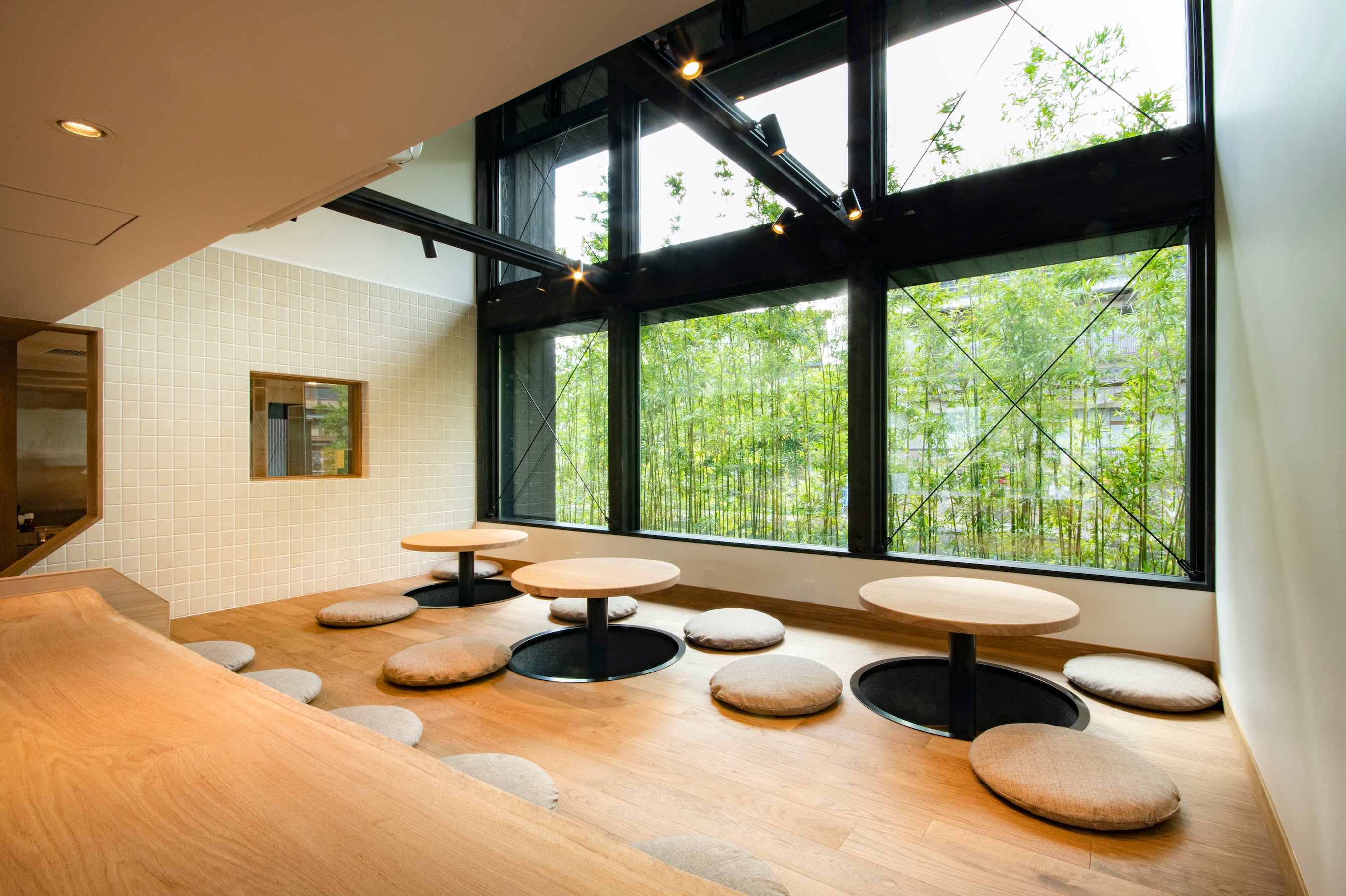 完全予約制にてご用意するお席は、天高窓の背景から緑竹と穏やかな川の流れを感じられる開放的な小上がり空間で、心ゆくまでお寛ぎいただけます。朝の澄み切った空気を感じながら早めの時間からのんびりと楽しんだり、散策の後にゆったりと景観を眺めて過ごすなど、一日を通してご利用いただけるアフタヌーンティーメニューです。
