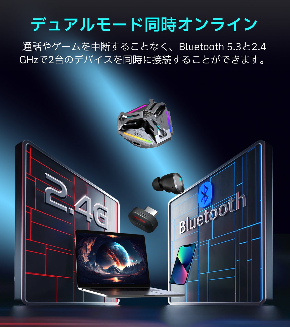 GX05はBluetoothでスマートフォンやタブレット、そして2.4GHzのUSB-Cドングルレシーバーでゲーム機やPCを接続することで、2台のデバイスと同時にペアリングすることが可能です。これにより、ゲーム中でも通話を続けることができ、ゲーマーの皆様にとって非常に便利な機能となっております。