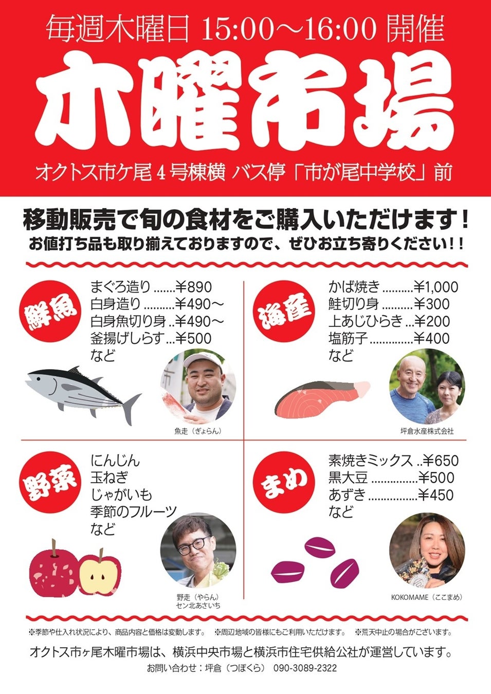 坪倉水産株式会社は買い物難民等の救済や食育の推進、魚食の再普を目的に、横浜市住宅供給公社は街の活性化や住民同士がつながる場の提供、賑わいづくり、利便性向上などを目的としてスタートしました。「木曜市場」として、毎週木曜15時から16時まで野菜・豆・水産加工品を販売し、隔週で鮮魚も販売しています。(鮮魚のみ15時半終了)。