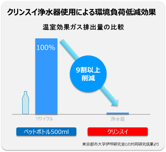 クリンスイの浄水器はより小さな環境負荷で水資源を活用することができます。東京都市大学との LCA(ライフサイクルアセスメント)研究(※)の結果、リサイクルペットボトルと比較しても9割以上の温室効果ガス(CO2等)削減が可能です。