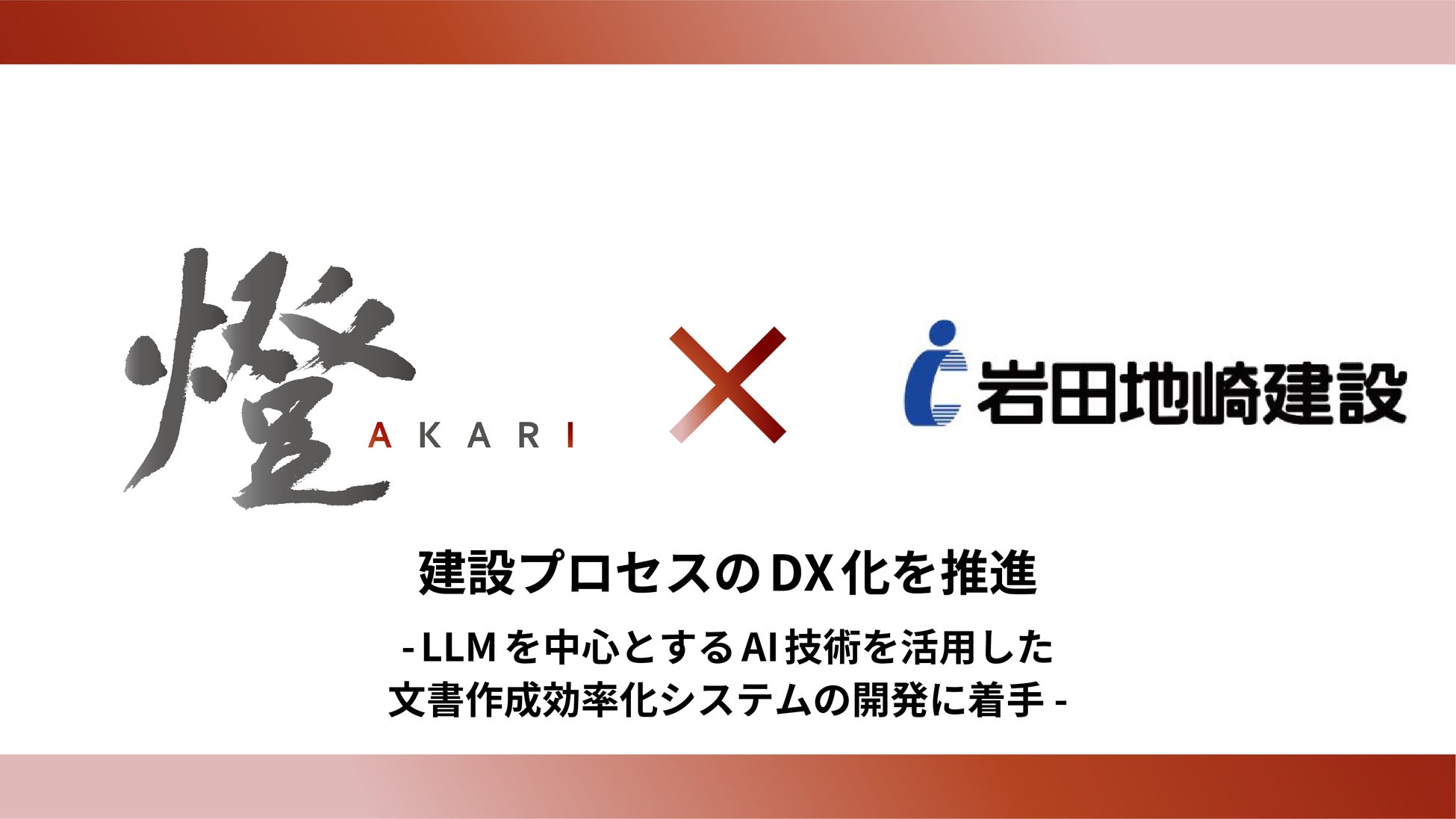 東京大学/松尾研究室発AIスタートアップ燈株式会社/Akari Inc.(本社所在地:東京都文京区、代表取締役CEO:野呂侑希、以下「燈」)と岩田地崎建設株式会社(本社所在地:札幌市中央区北2条東17丁目2番地、代表取締役社長:岩田 圭剛、以下「岩田地崎建設」)は、2022年 12 月より協業を開始し、昨今話題となっている LLM 等の AI 技術を用いた業務フロー改善を通じたDXに取り組んでまいりました。今回、文書作成業務に対し、これらの AI を搭載したシステムの開発に着手いたしました。
