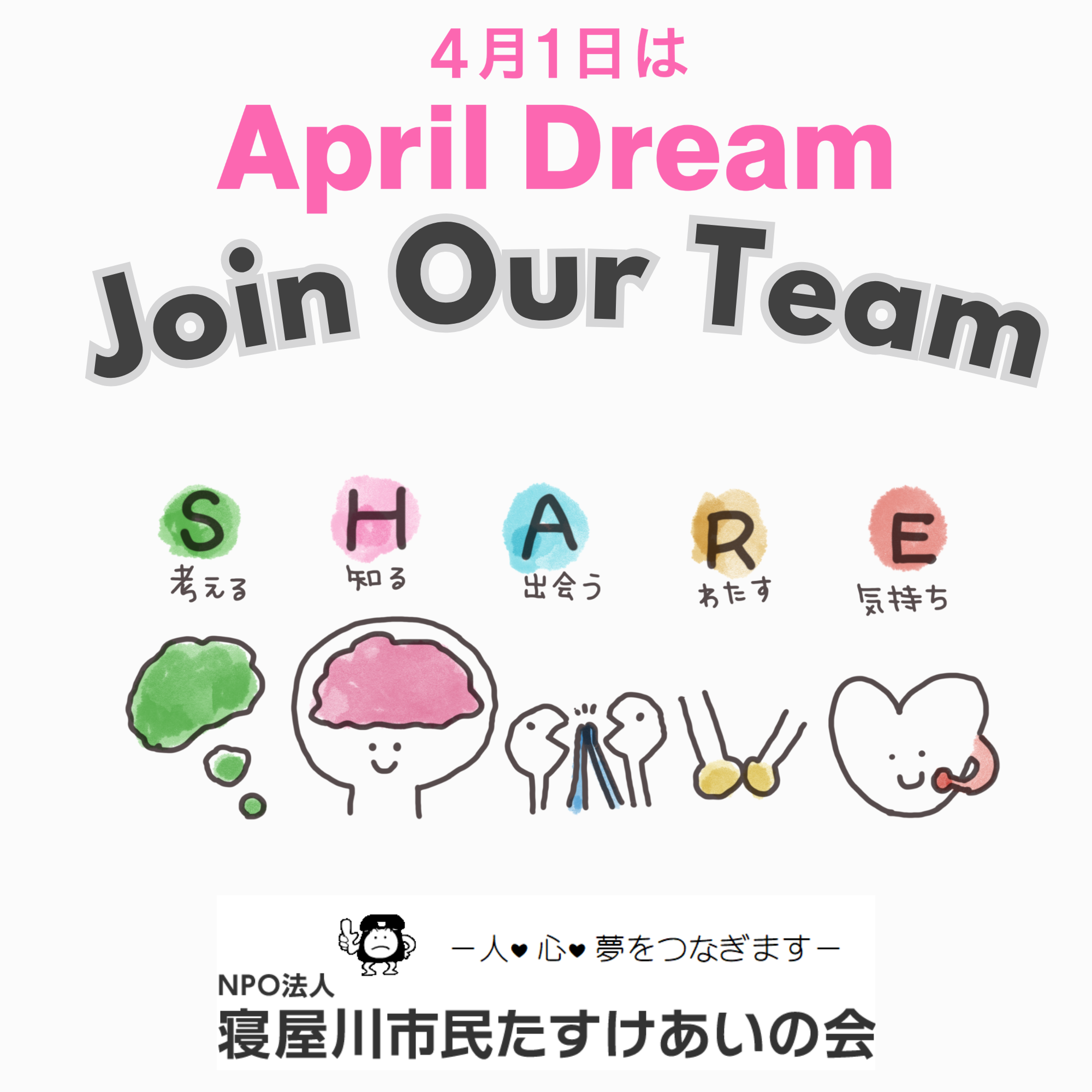 わたしたちは、4月1日を夢を発信する日にしようとするApril Dreamに賛同しています。このプレスリリースはわたしたち「特定非営利活動法人 寝屋川市民たすけあいの会」の夢です。