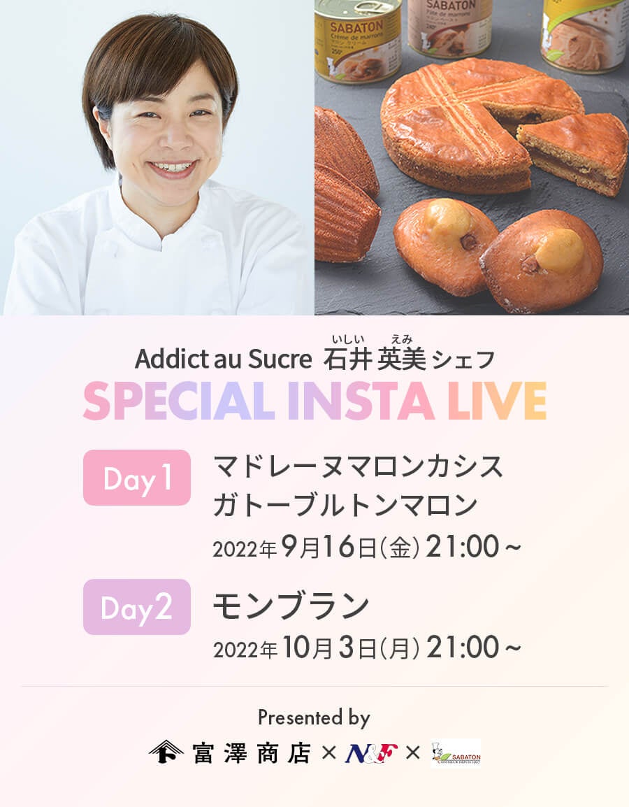 日本最大の製菓・製パン材料、器具専門店として創業103年の株式会社富澤商店は、豪華賞品プレゼントキャンペーンが当たる「第3回富澤商店モンブラン選手権」をInstagram、Twitterで10月31日(月)まで開催しています。また、本キャンペーンを記念して多数メディア出演をしている都立大学駅の有名パティスリー「Addict au Sucre」の石井英美シェフをお迎えし、9月・10月と続けてマロンレシピをご紹介するインスタライブを開催します。