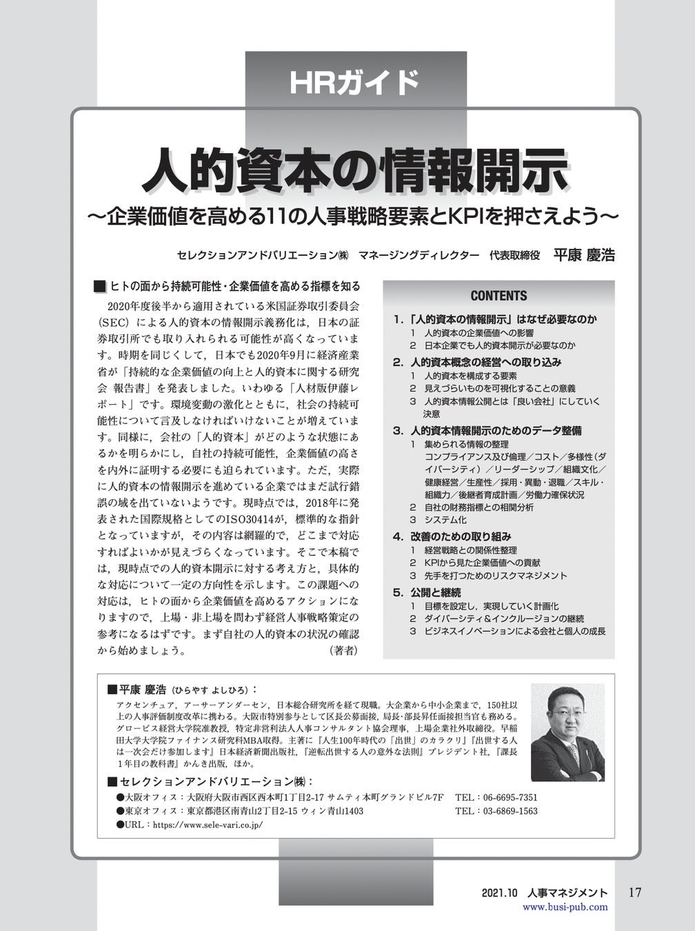 人的資本情報開示コンサルティングについての概要は、2021年に月刊人事マネジメントに公開したこちらの記事を参照してください。