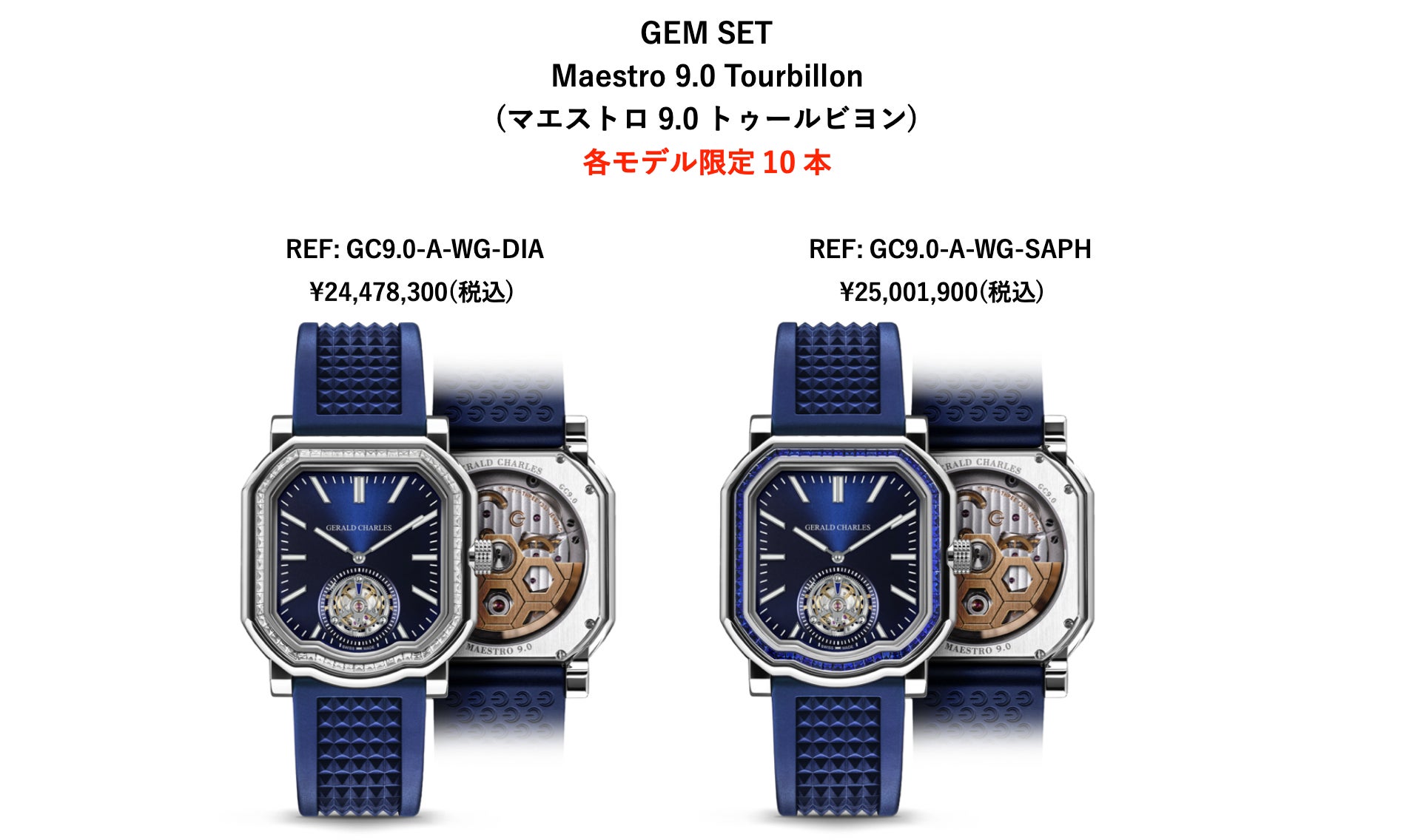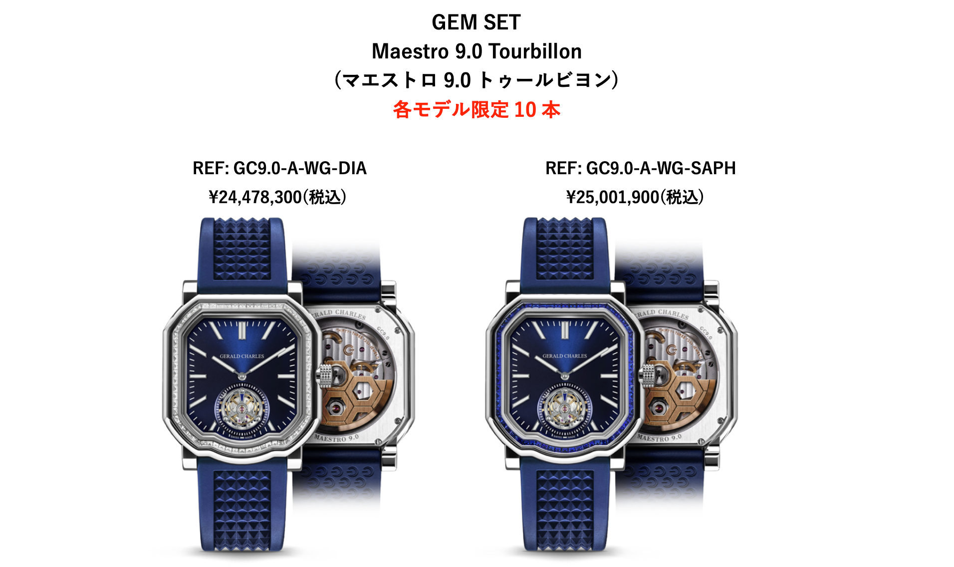 Maestro9.0 Tourbillon(マエストロ 9.0 Tourbillon)GEM-SETは2モデルが並び、ダイヤモンドまたはサファイヤが施されたタイプからお選びいただけます。各モデル世界限定10本となります。ストラップ展開はクル・ド・パリ仕上げが施されたラバー仕様のみとなり、文字盤の色と同色のストラップが純正となります。