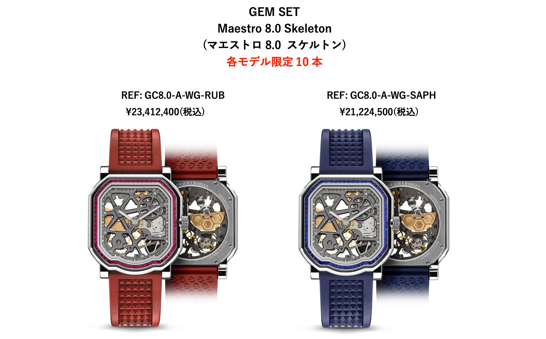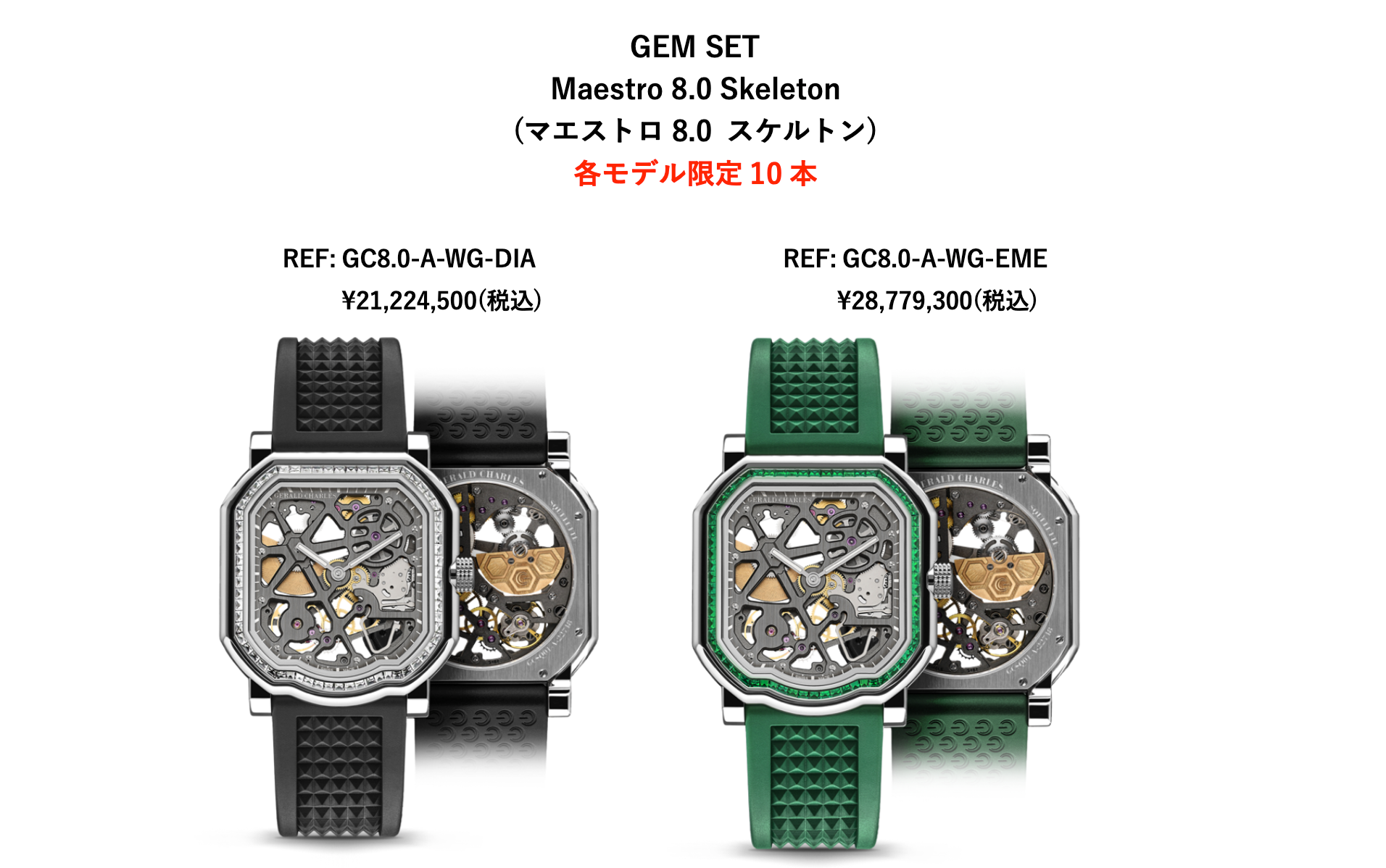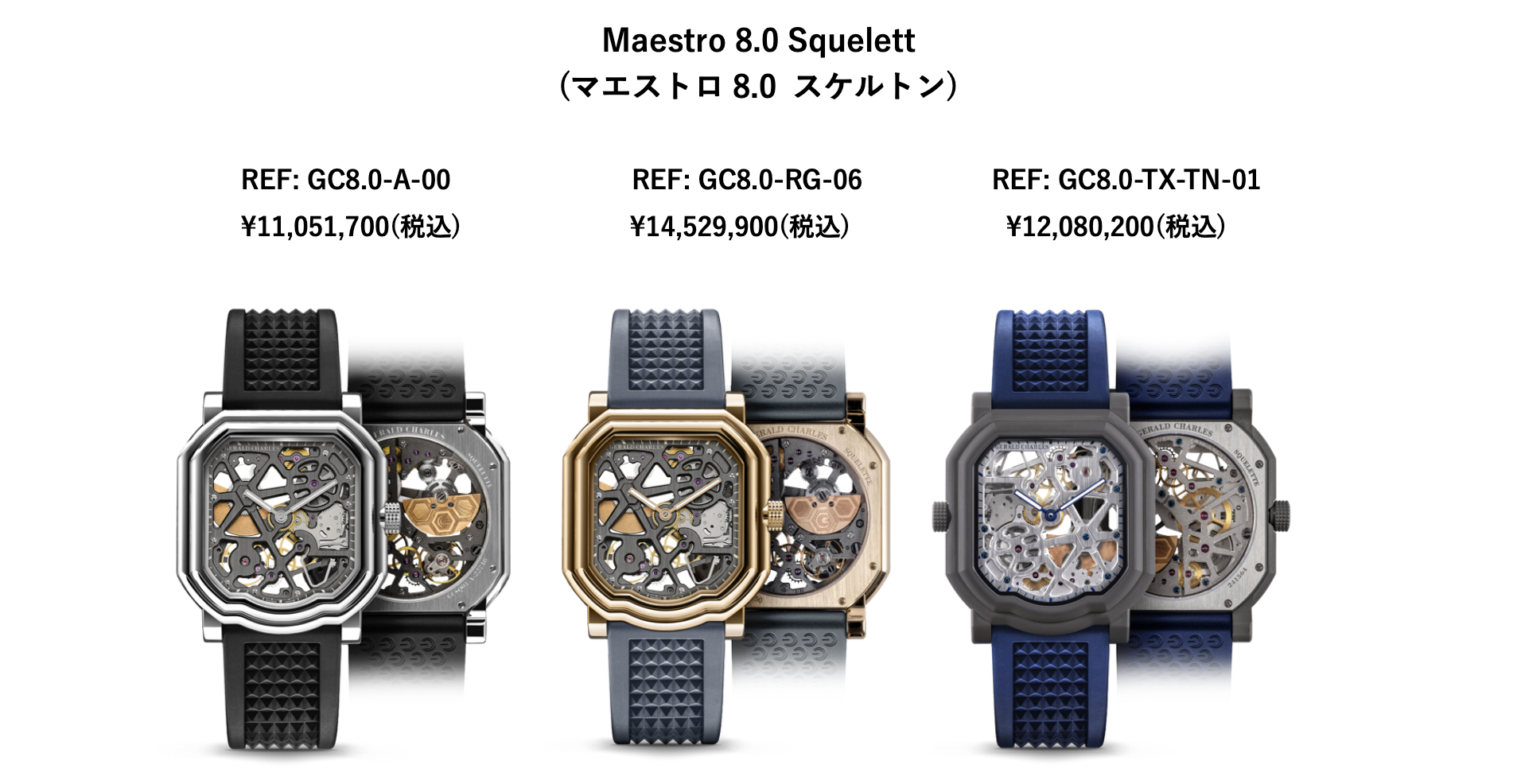 8.0 Squelette (マエストロ8.0 スケルトン)はステンレス・スティールモデル、18Kピンクゴールドモデル、左リュウズのGC Sportグレード5チタンモデルの全3モデルが展開されています。全てスケルトン仕様となっており、ストラップはクル・ド・パリ仕上げが施されたラバー仕様のみとなり、文字盤の色と同色のストラップが純正となります。