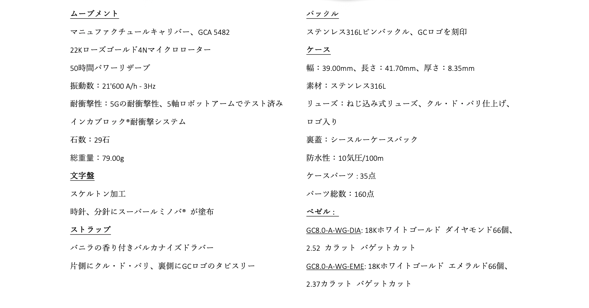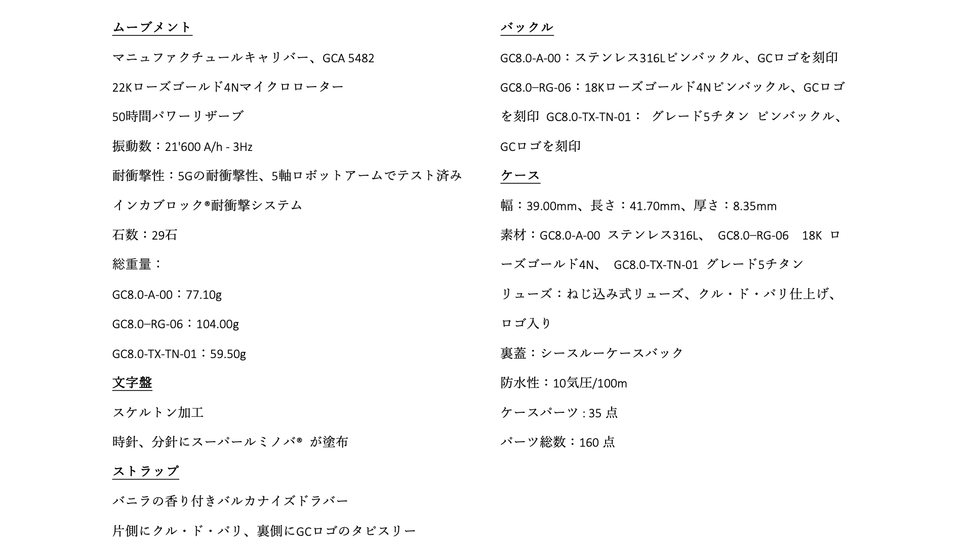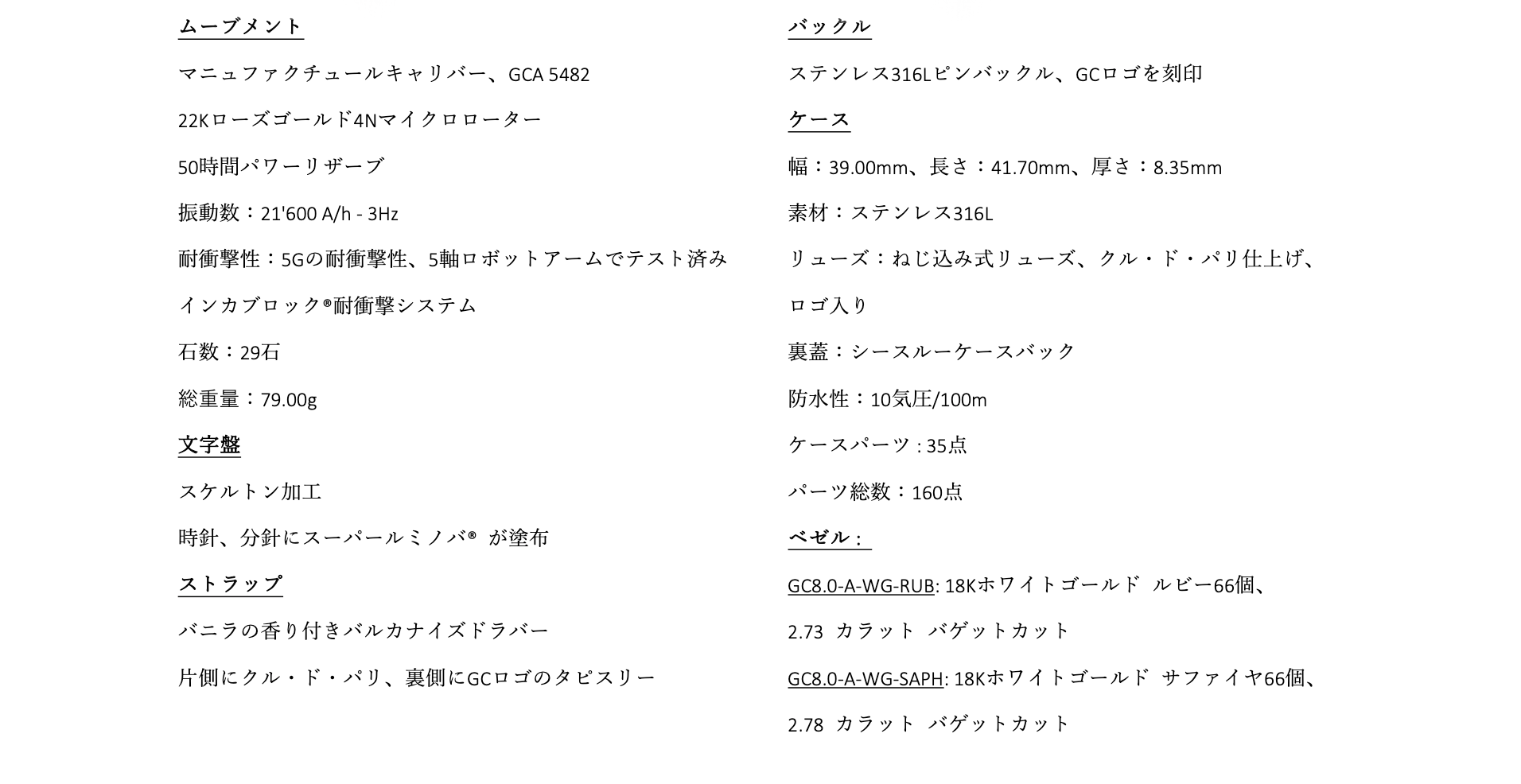 8.0 Squelette (マエストロ8.0 スケルトン)はステンレス・スティールモデル、18Kピンクゴールドモデル、左リュウズのGC Sportグレード5チタンモデルの全3モデルが展開されています。全てスケルトン仕様となっており、ストラップはクル・ド・パリ仕上げが施されたラバー仕様のみとなり、文字盤の色と同色のストラップが純正となります。