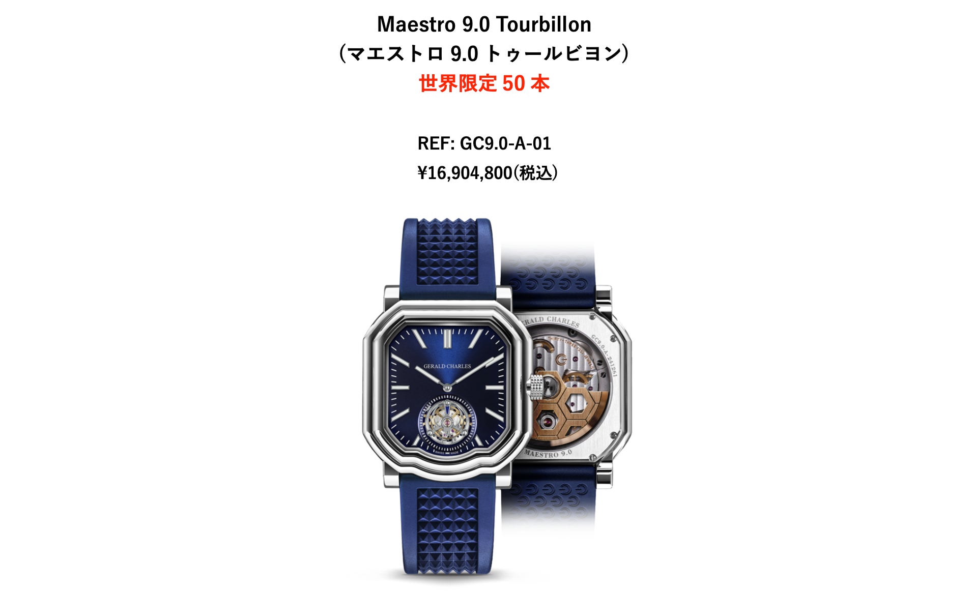 Maestro9.0 Tourbillon(マエストロ 9.0 Tourbillon)はジェンタ氏が2005年にデザインした、マエストロ・フライング トゥールビヨンをベースに、当メゾンによって考案された、最も技術的かつ美的に進化したモデルです。このモデルは、クリエイティブ・ディレクター : オクタヴィオ・ガルシア氏との共同開発で作られ、GCA 3024/12オートマチック・フライング・トゥールビヨンキャリバーによって駆動されています。このキャリバーは、当メゾンの長年のパートナーであるヴォーシェ・マニュファクチュール・フルリエ社によって製造されました。『Gerald Charles (ジェラルド・チャールズ)』の時計哲学に従い、フライング トゥールビヨンという複雑機構でありながら、日常でも気軽に身につけることができるようデザイン・設計されています。