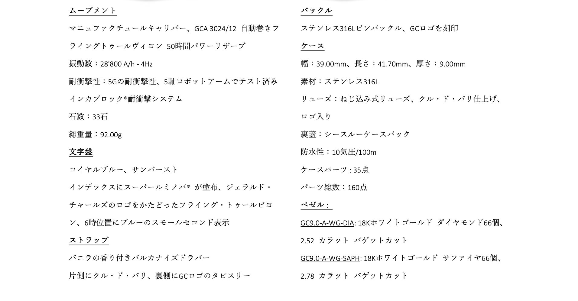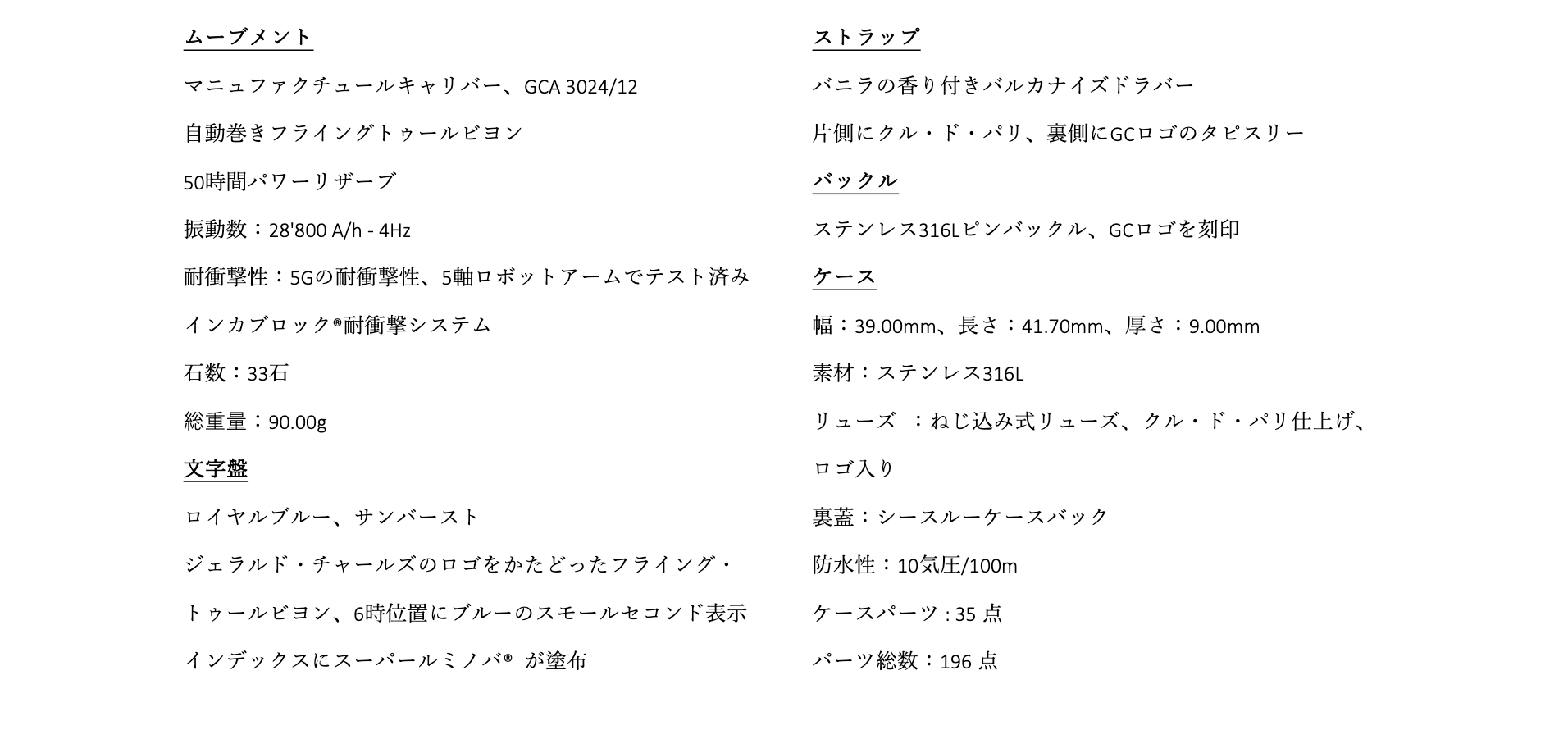 社長のフェデリコ・ジヴィアーニ氏は「この水準に達するには莫大な技術力が必要になりました。しかし当メゾンのエンジニアとヴォーシェ・マニュファクチュール・フルリエ社の協力により達成することができました。私たちはこの完成度に非常に満足しています。見えないパーツも、スイスの高級時計として非の打ちどころのない基準に仕上げられ、一切妥協のないタイムピースとなりました」と述べました。