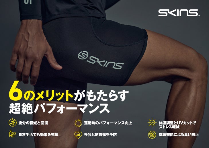 SKINSのコンプレッションウェアは独自の「段階着圧」設計を採用しており、世界中のアスリートから高い評価を得ています。