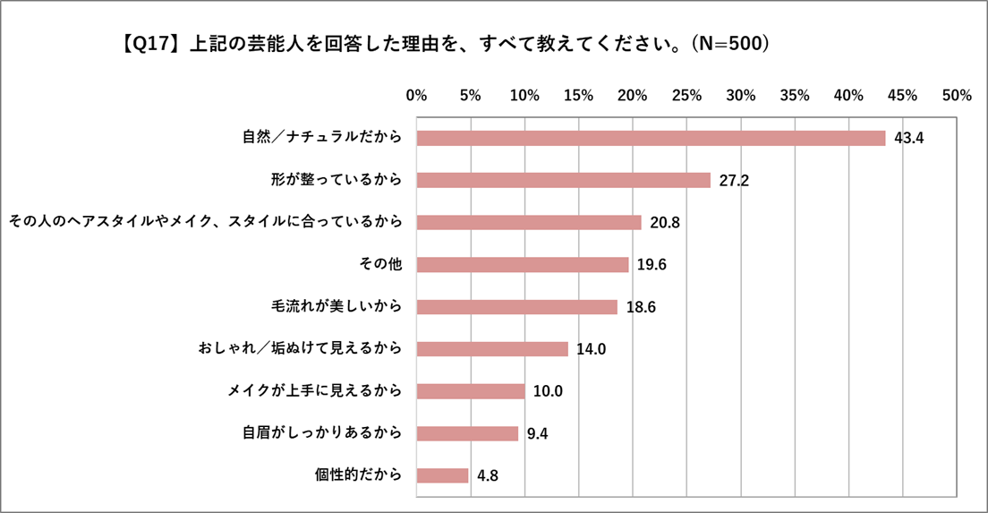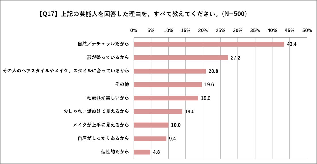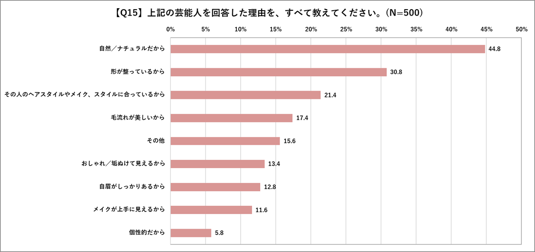 理由としては、石原さとみさん・綾瀬はるかさんには「自然/ナチュラルだから」・「その人のヘアスタイルやメイク・スタイルに合っているから」という声が多く寄せられました。1番に票を集めた北川景子さんには、「自然/ナチュラルだから」・「形が整っているから」だけでなく「毛流れが美しいから」などの声が多く寄せられ、毛流れにも注目し、憧れを抱いている方が多いと判明しました。
