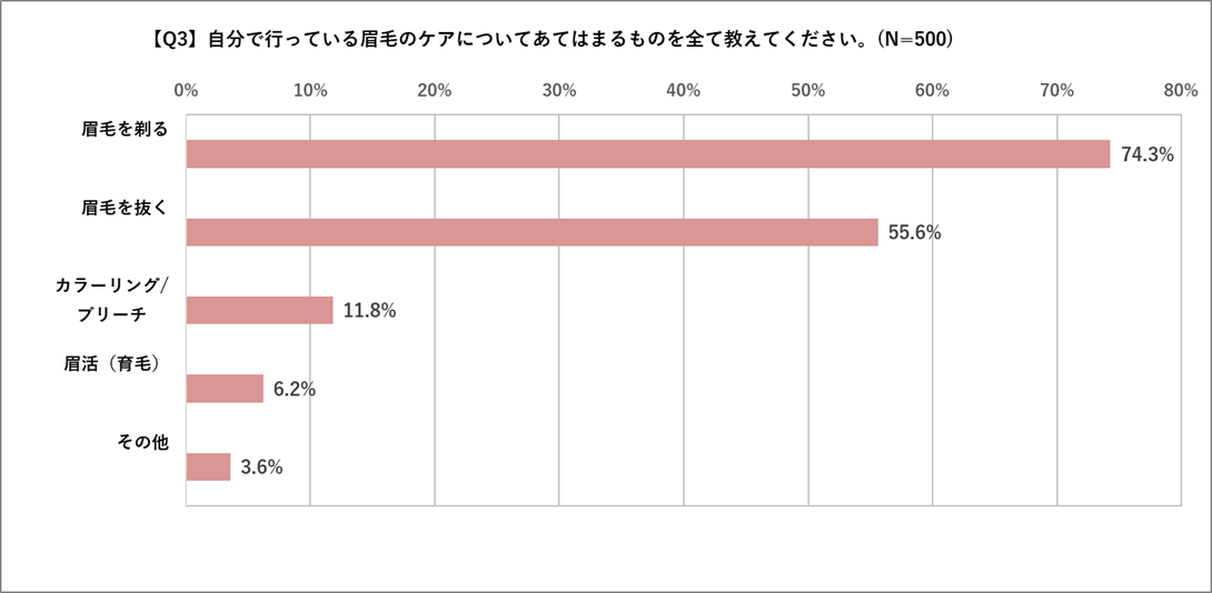 さらに、「自分で行っている眉毛ケア」の方法についても質問したところ、最も多かったのは「眉毛を剃る」(74.3%)、次いで「眉毛を抜く」(66.6%)、大きく数字が離れて「カラーリング・ブリーチ」(11.8%)、次いで「眉活(育毛)」(6.2%)という結果となり、剃る・抜くなど毛量を調整することで「眉毛を整えたい」方の割合が70%以上と、非常に高いことが分かりました。また、その他については全て「カット」という回答でした。