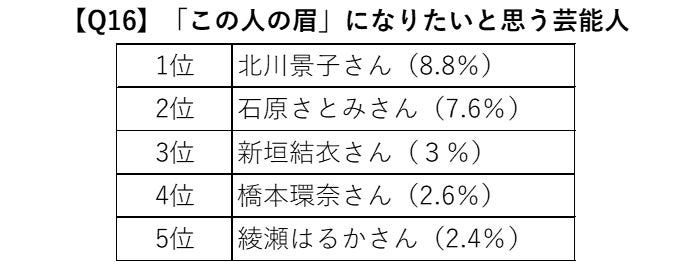 続けて、「この人の眉になりたい」と思う芸能人を質問したところ、3位は「新垣結衣さん」(3%)、