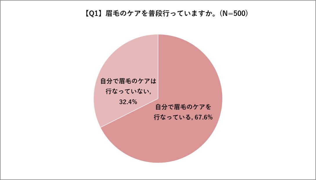 全国の10代~50代の女性500名に眉毛ケアを普段から行っているかを質問したところ、「自分で眉毛のケアを普段行っている」のが67.6%と約7割の方が日頃から意識していることが分かりました。また「自分で眉毛ケアは行っていない」は32.4%という回答になりました。