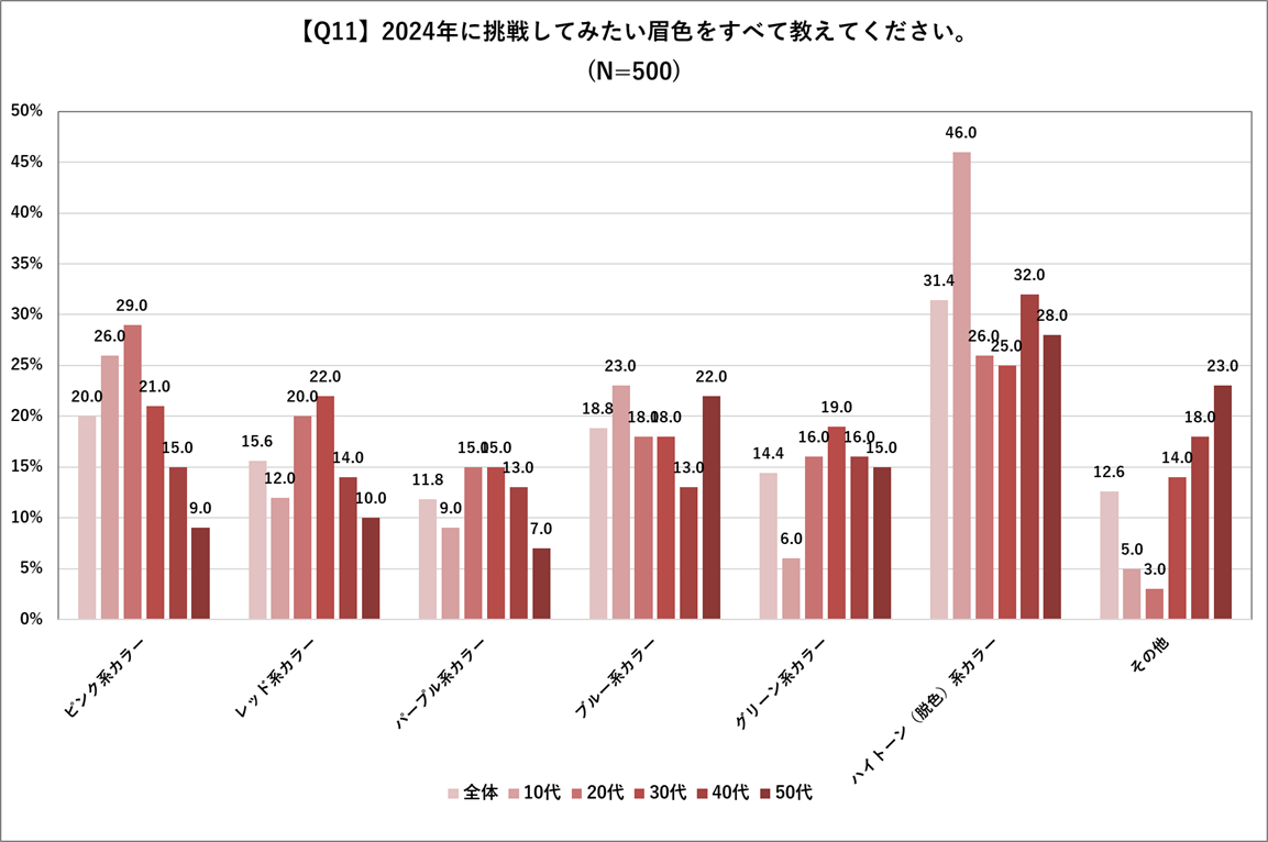 また「【Q7】2024年、イメージチェンジしてみたいと思いますか」「【Q11】2024年に挑戦したい眉色を教えてください」について、年代別にクロス集計したところ、イメージチェンジをしてみたいと約7割の方が回答した10代の方は、約半数(46%)の方が「ハイトーン(脱色)系カラー」に挑戦したいと回答しました。暗い髪色でもワントーン明るい眉カラーや、ブリーチ眉毛への人気が高まっており、特に若年層を中心に、ハイトーン眉カラーが2024年のトレンドとして伺えます。その他の回答として多く挙げられたのは「ブラウン」・「ダークブラウン」です。