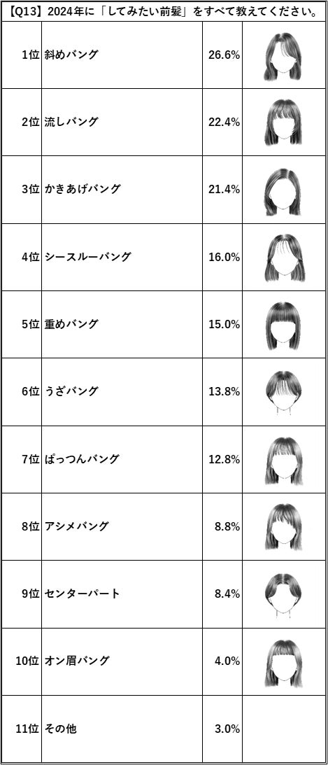一方で「2024年やってみたい前髪」の人気トップ3位は「斜め/流し/かきあげバング」に!