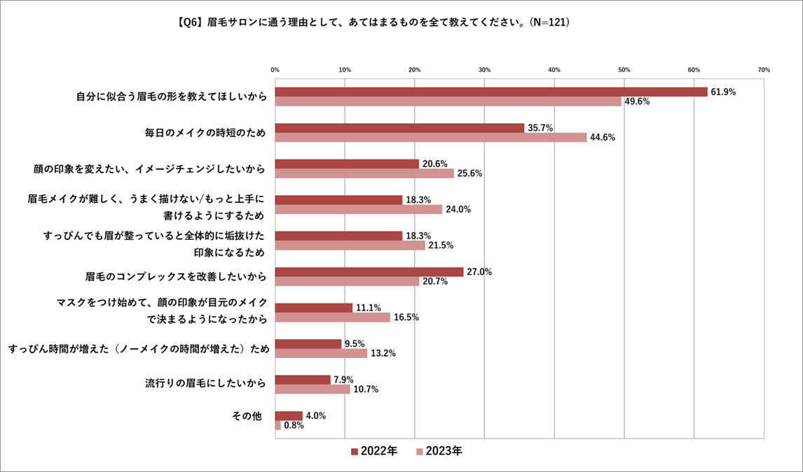 眉毛に関する施術を受けにサロンに通う理由も質問したところ、昨年の調査同様に、最も多くの方が「自分に似合う眉毛の形を教えてほしいから」(49.6%)と回答し、プロに聞くことで理想の眉毛を手に入れたい方が多いことが伺えます。次いで「毎日のメイクの時短の為」(44.6%)の回答が多く、昨年実施した調査では35.7%だった結果と比べて9.9%増加していることから、日々時間がかかる「メイクの時短」に高い価値を感じる方が多いことが判明しました。そして3位には25.6%の方が「顔の印象を変えたい、イメージチェンジしたい」と回答し、眉が変わることで顔全体の印象が変わることを実感している方が多いと伺えます。