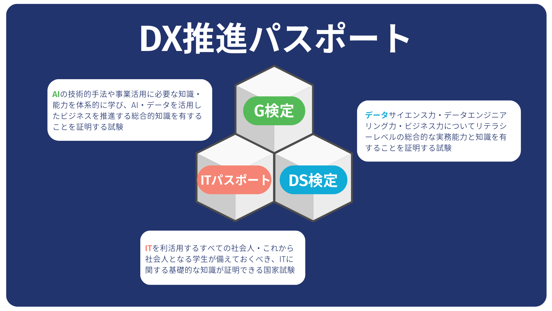 DX推進パスポートとは、デジタル人材育成のさらなる加速を目指し、DXを推進するプロフェッショナル人材に必要となる基本的スキルを証明するデジタルバッジであり、「ITパスポート試験」、「DS検定 リテラシーレベル」、「G検定」の3試験に合格することで取得できます。