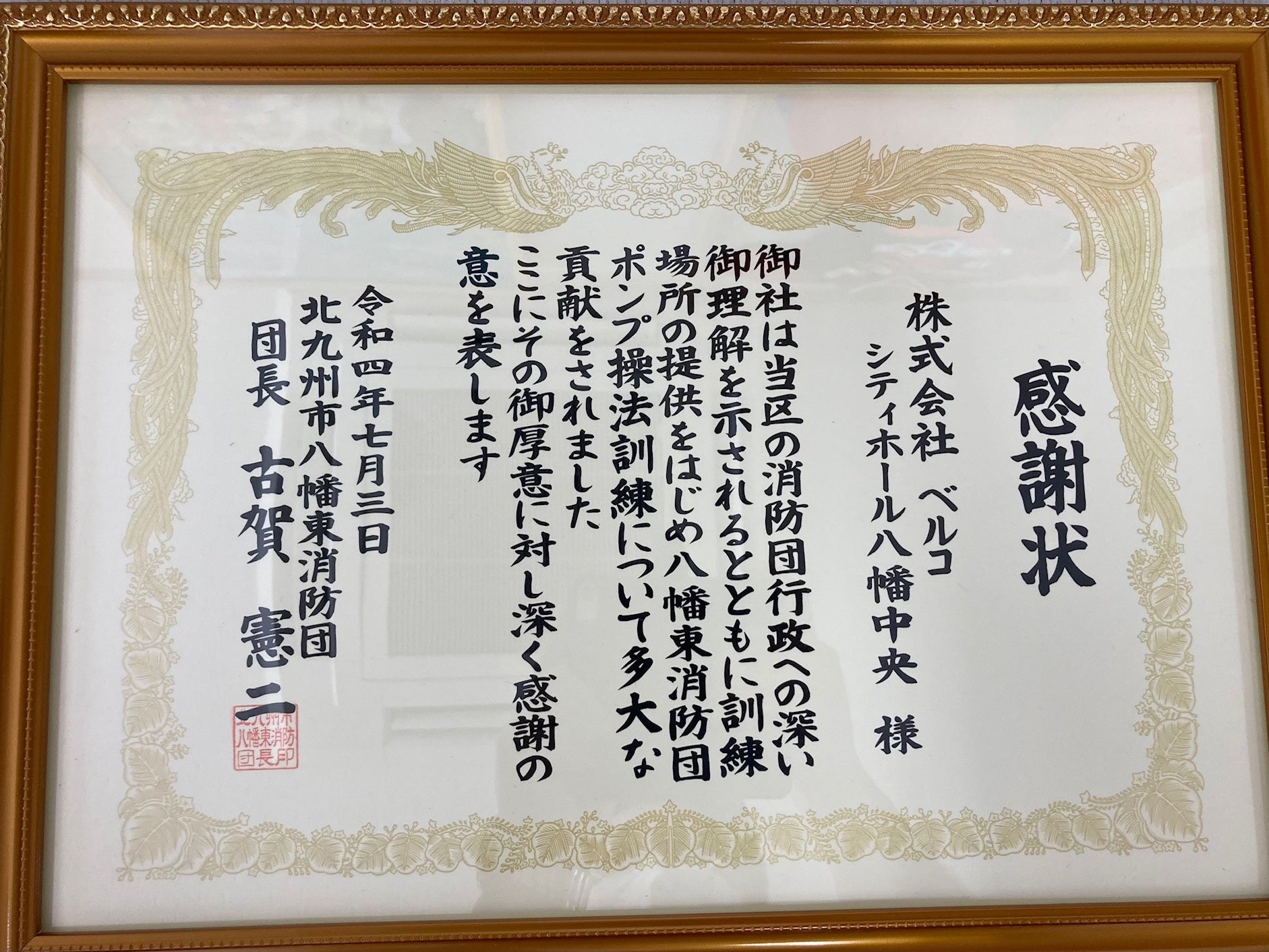 このたびの感謝状は、当社の「シティホール八幡中央」が、以前より消防団の訓練場所として提供を行ってきたに加え、7月に行われた「北九州市消防ポンプ操法大会」に向け、八幡東消防団の操法訓練に協力したことを評価いただいたものです。