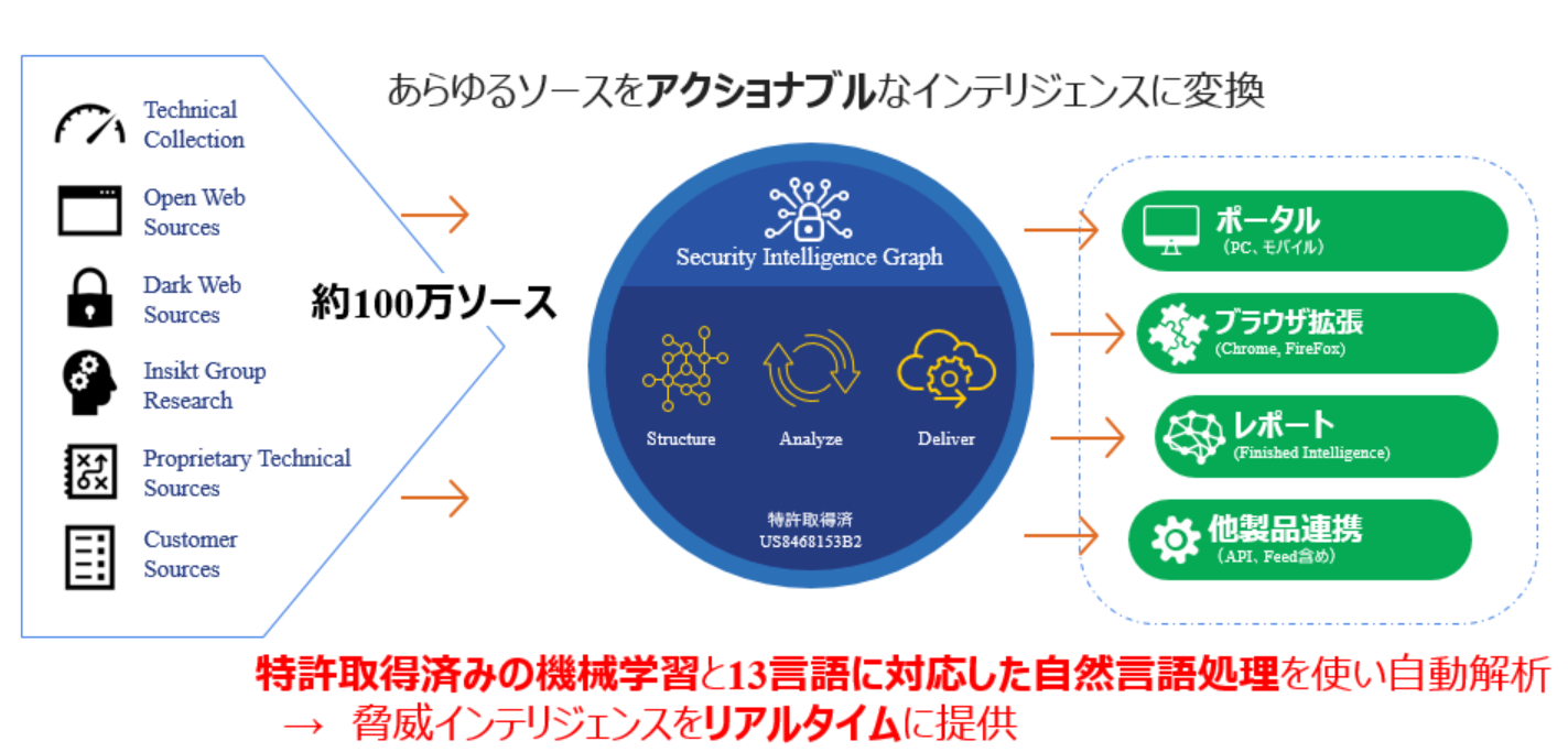 収集した情報の整理・分類を最適化するために開発された特許取得済みのマシンラーニング技術と、13言語に対応した自然言語処理を組み合わせて用いることでセキュリティインテリジェンスをリアルタイムに提供することができます。