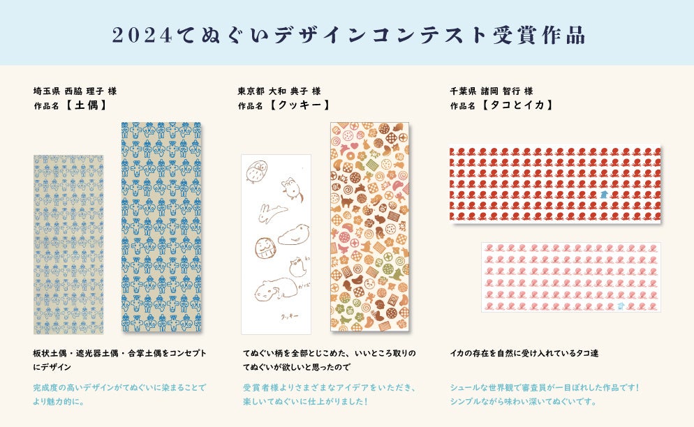 2024年に同イベントで開催した『てぬぐいデザインコンテスト』の受賞作品3柄が、今回のイベントで初お目見え。どれも個性あふれる素晴らしいデザインばかり!ぜひ会場で実際にお手に取ってご覧ください。