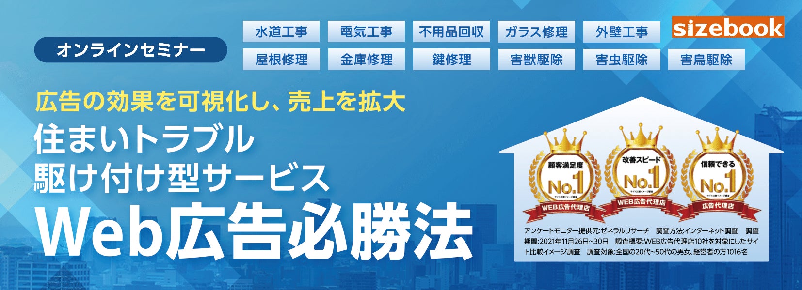 株式会社sizebook(本社:東京都港区、代表取締役:寺本光宏)は、2024年12月11日(水)・12日(木)の13:00~14:00および17:00~18:00に、ウェビナー『住まいトラブル駆け付け型サービスWeb広告必勝法』を開催いたします。