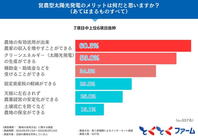 『 農地の有効活用が出来、農家の収入を増やすことができる(60.3%)』が最も多く、『 クリーンエネルギー(太陽光発電)の生産ができる(53.0%)』『 補助金・助成金などを受けることができる(34.3%)』『 固定資産税の軽減ができる(29.8%)』『 天候に左右されず、農業経営の安定化ができる(25.0%)』『 土壌流亡を防ぐなど、農地の保全ができる(15.1%)』と続きました。