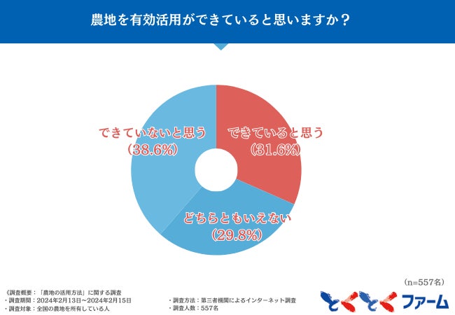 「農地を有効活用ができていると思いますか?」と聞いたところ、『できていると思う(31.6%)』『どちらともいえない(29.8%)』『できていないと思う(38.6%)』と、農地の有効活用ができていないという方が約4割と最多の結果となりました。
