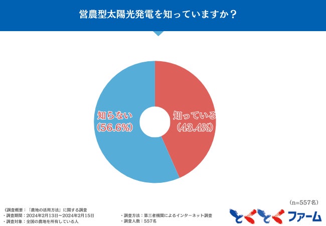 そこで、「営農型太陽光発電を知っていますか?」と聞いたところ、『知っている(43.4%)』と約4割以上の方は知っていると回答しました。