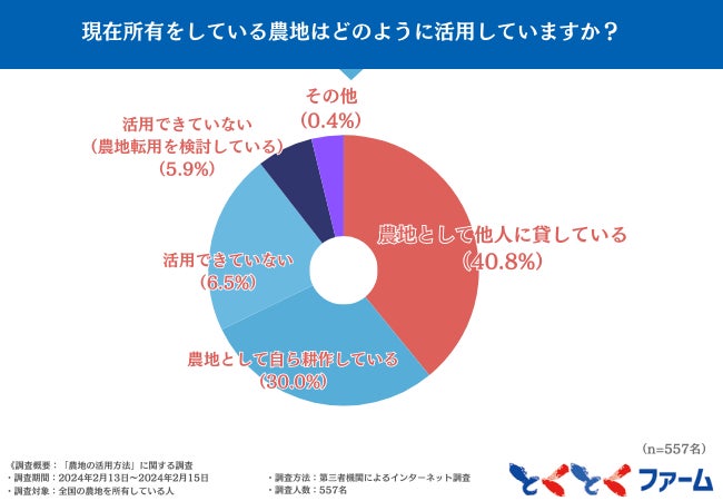 「現在所有をしている農地はどのように活用していますか?」と聞いたところ、最も多かった回答は、『 農地として他人に貸している(40.8%)』で、次に多かったのは『 農地として自ら耕作している(30.0%)』となりました。