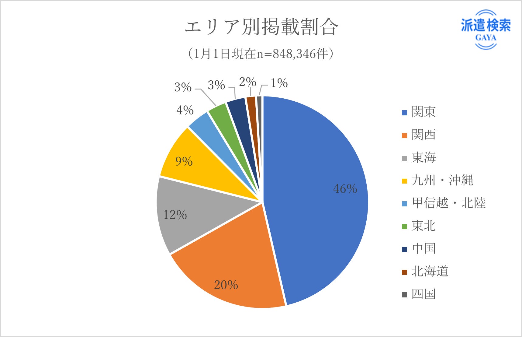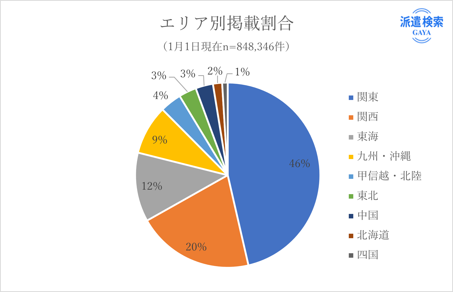 派遣検索GAYAに掲載されている2024年1月度 エリア別の派遣求人掲載件数は関東46%、関西20%、東海12%、九州・沖縄9%、甲信越・北陸4%、東北3%、中国3%、北海道2%、四国1%という結果になりました。また、全体の掲載件数ではデータ抽出日が1月1日元日ということもあり、12月度の929,647件から81,301件減の1月848,346件となりました。