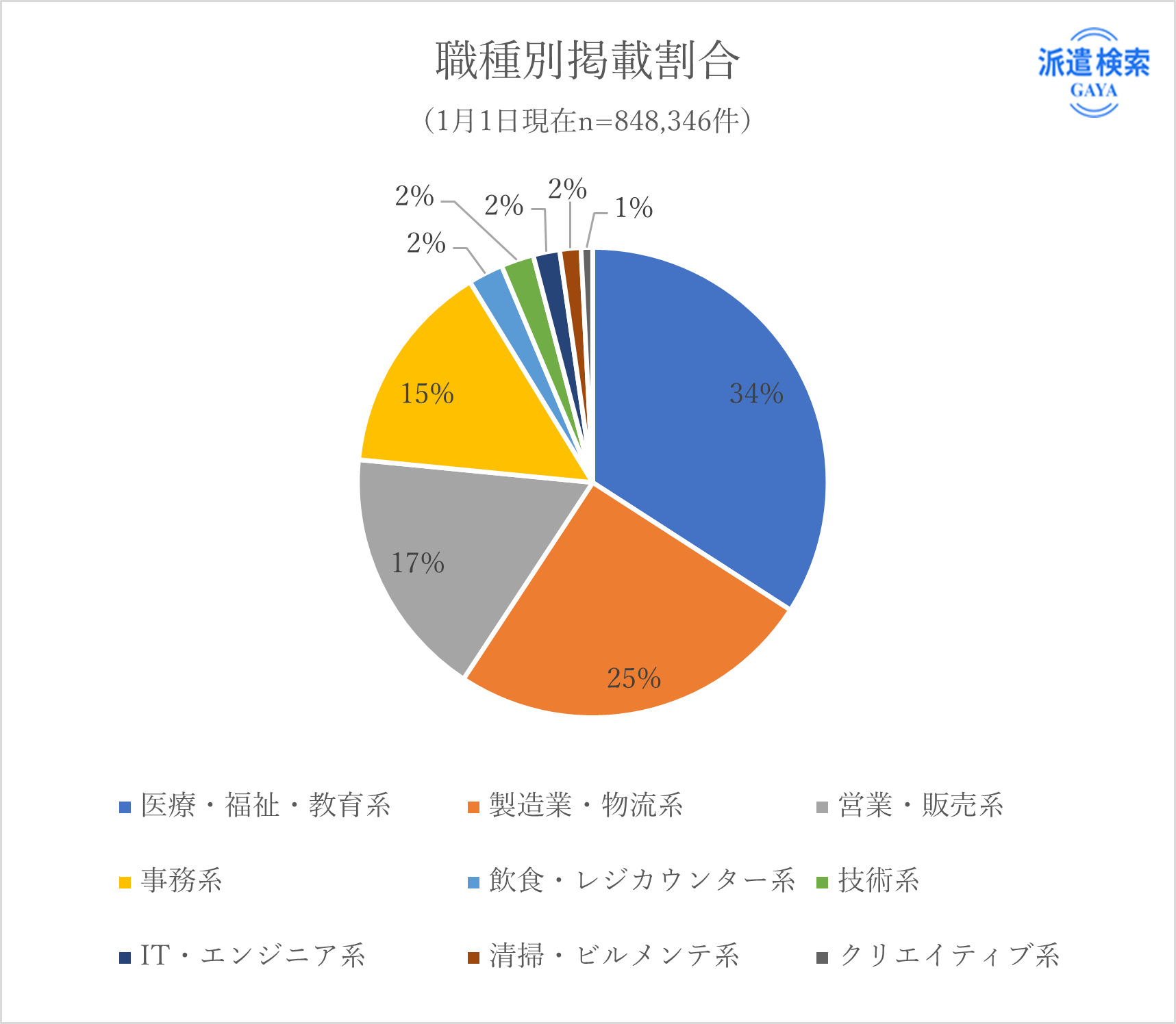 派遣検索GAYAに掲載されている2024年1月度 職種別の派遣求人掲載件数のうち最も多い職種は「医療・福祉・教育系」の34%でした。続いて製造業・物流系25%、営業・販売系17%、事務系15%、と12月と同じ順位となりました。職種ごとに増減はありましたが上記4職種で全体の90%以上を占める結果となりました。