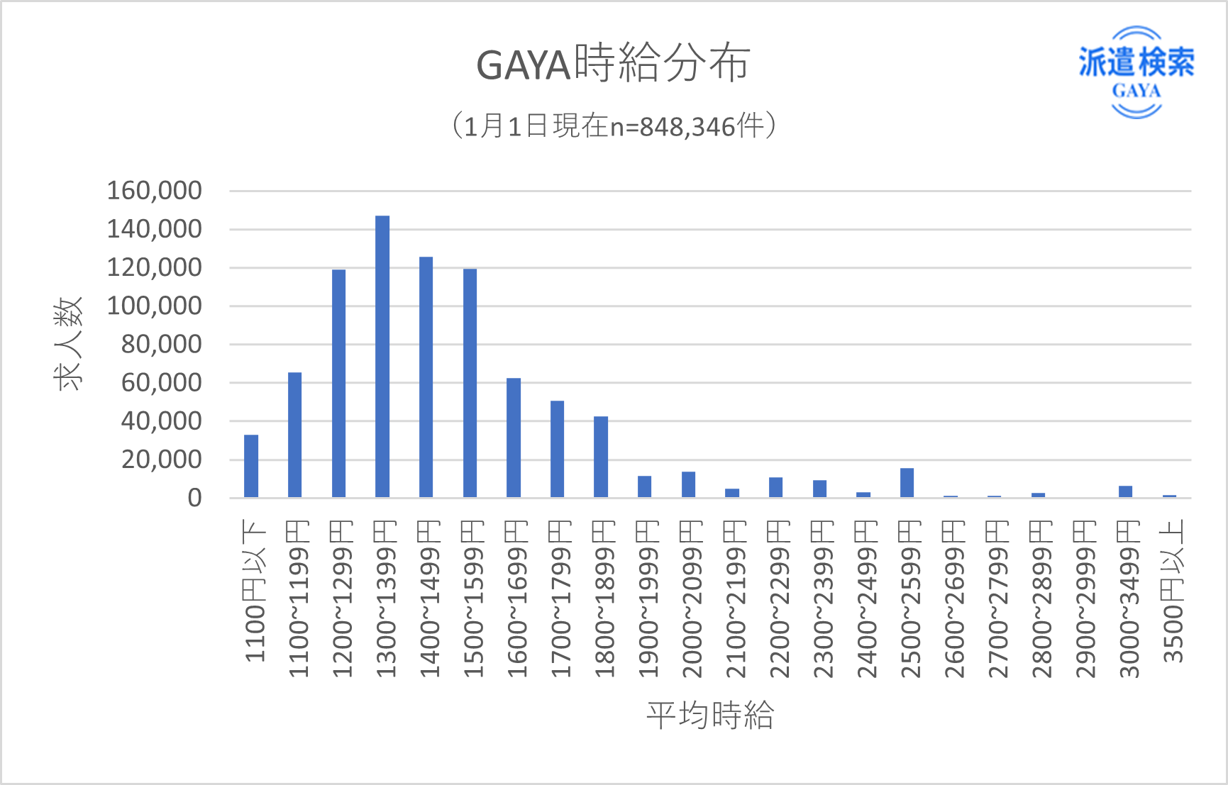 派遣検索GAYAに掲載されている2024年1月度 全国の派遣求人の平均時給は1,487円でした。2023年12月と比較すると38円減少しております。求人全体の時給を細分化してみると1番多い時給が1,300円~1,399円と全体の17.3%、1,400円~1,499円14.8%、1,500円~1,599円14.0%、1,300円以上の時給が全体の74.3%と高い数字をキープしています。