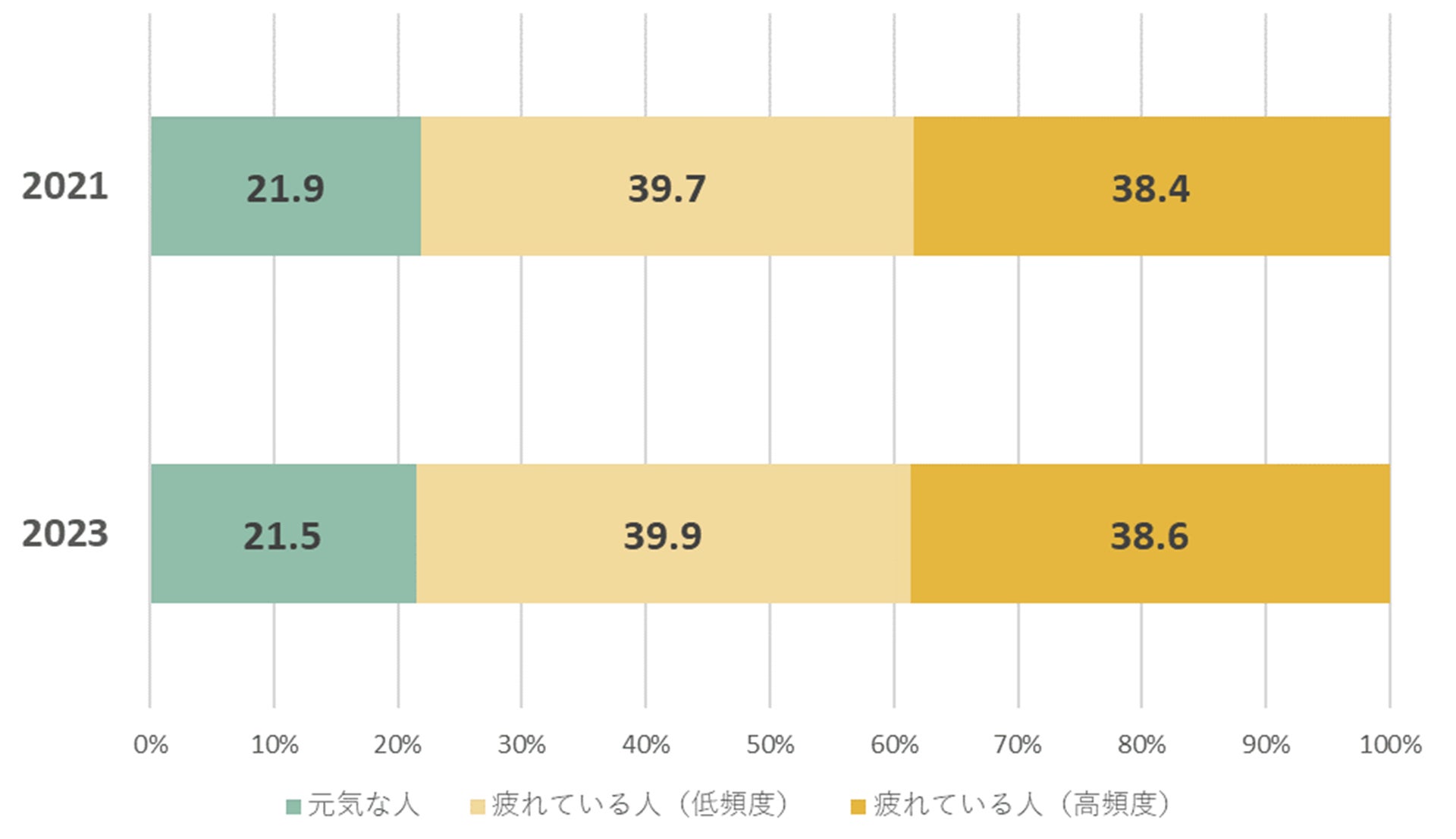 現役世代内では40代までの疲労状況が高く、とくに20代・30代女性は「元気な人」がわずか1割で、「慢性的に疲れている人」は5割を超え、2022年も日本では、若い女性の疲労が深刻な状態です。