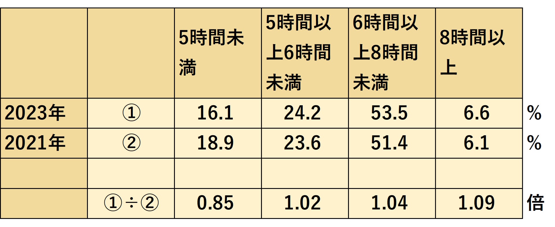 〈図表6:睡眠時間(全国、男女計、20~79歳、2021-23年比較)単位:%、倍〉