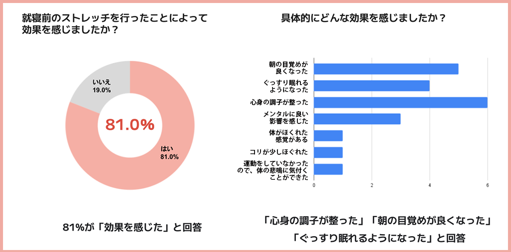 「就寝前に自律神経を整えるストレッチに取り組んだことによって睡眠への効果を感じたかどうか」についての質問に対して、81.0%が「効果を感じる」と回答。具体的に感じた効果については「心身の調子が整った」「メンタルに良い影響を感じた」「朝の目覚めが良くなった」「ぐっすり眠れるようになった」といった声が寄せられ、就寝前のストレッチで自律神経を整えたことで快眠につながったことが示唆されました。