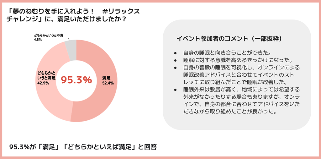 イベント終了時に参加者に行ったアンケートでは、「夢のねむりを手に入れよう! #リラックスチャレンジ」に、95.3%が「満足」「どちらかといえば満足」と回答。