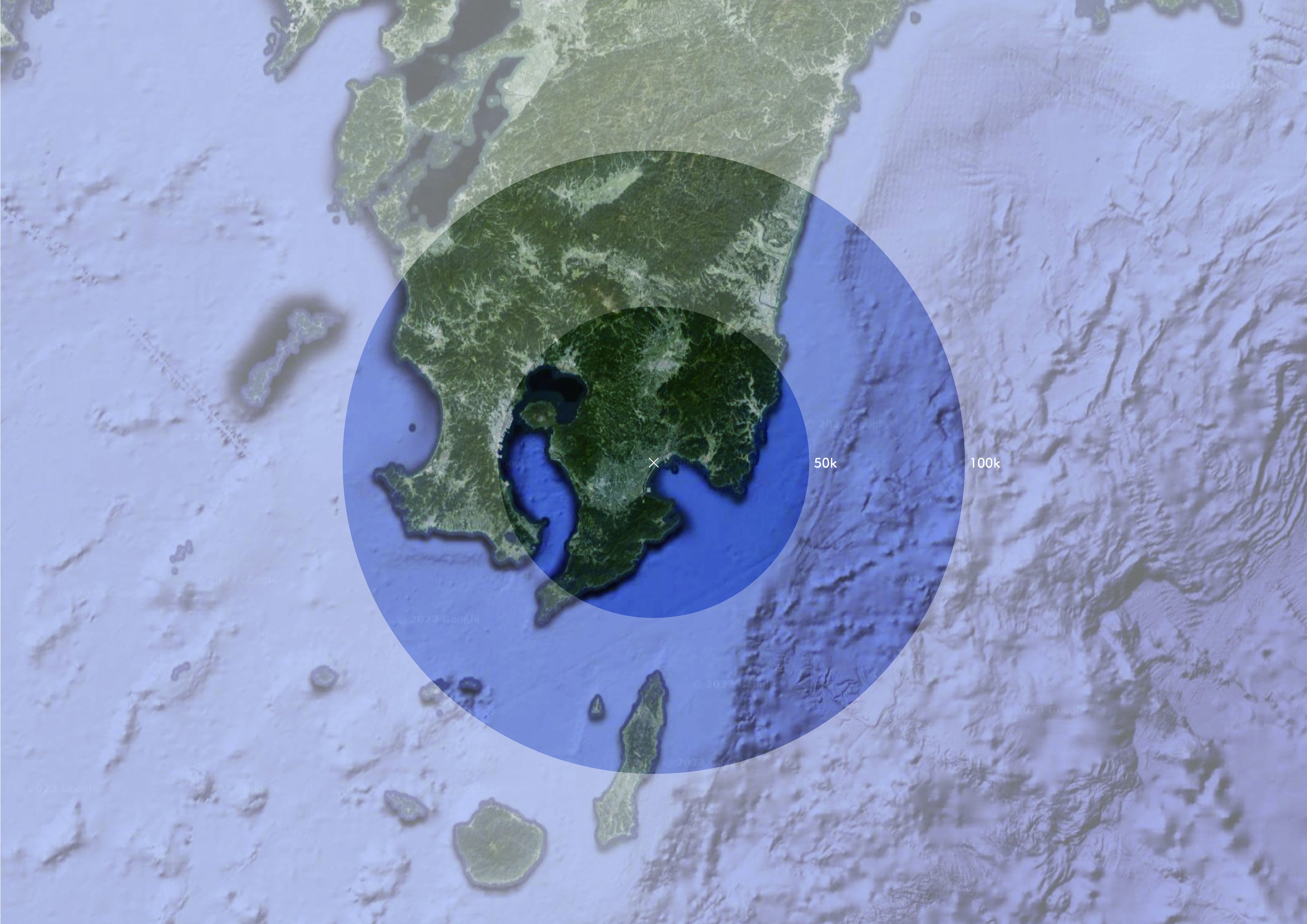 ▲大崎町を中心とした100km圏(参照:google map)(例:鹿児島県出水市、熊本県人吉市、宮崎県川南町、鹿児島県枕崎市などは100km圏内)