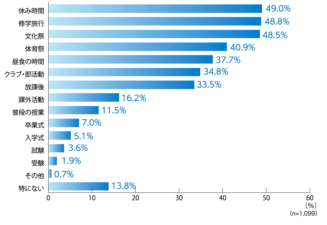 ・学校生活で好きな時間・行事は、「休み時間」という回答が最多(49.0%)、僅差で「修学旅行」(48.8%)、「文化祭」(48.5%)