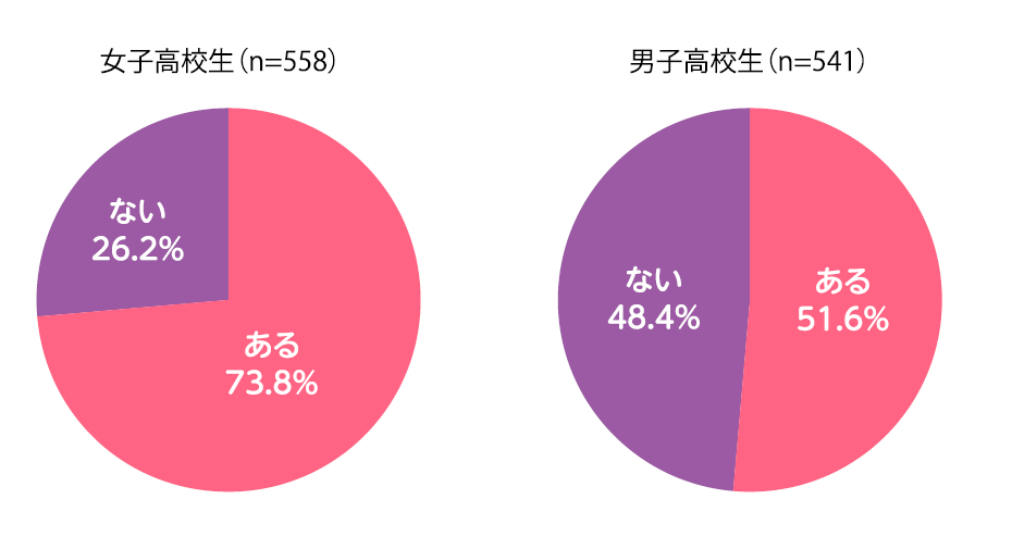 その学校生活を写真に撮ることについては、女子高校生は写真を撮ったことが「ある」(73.8%)という回答が多く、男子高校生も写真を撮ったことが「ある」(51.6%)という回答が半数を超えていることから、高校生の多くが学校生活や放課後に写真を撮っていることがわかりました。