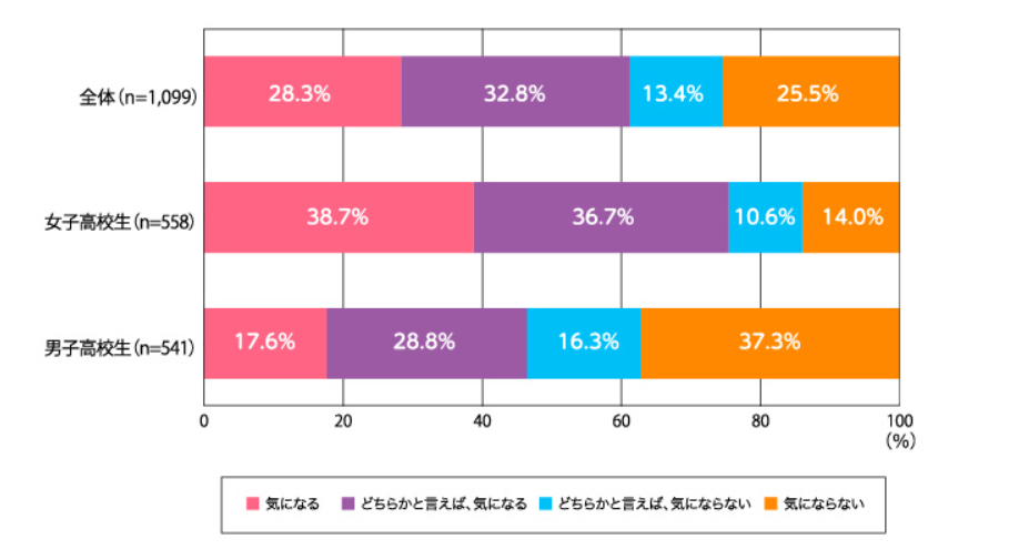 学校生活で着用している制服について、他の学校の制服がどんなデザインか気になるという回答は、全体では「気になる」(28.3%)と「どちらかと言えば、気になる」(32.8%)をあわせると、約6割が気になると回答しています。男女別でみると、女子高校生は「気になる」(38.7%)と「どちらかと言えば、気になる」(36.7%)をあわせると、制服デザインを気にしているという回答が7割以上となり、他校の制服デザインを気にしている割合が、女子は男子に比べて高くなる傾向がみられました。
